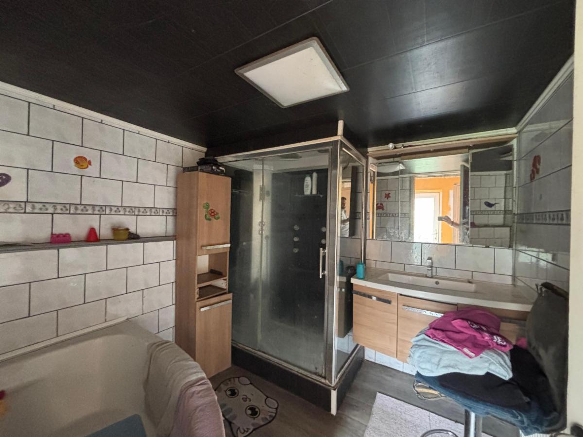 Rez-de-chaussée : hall d’entrée, salon, salle à manger, cuisine, salle de bain, WC et garage.
