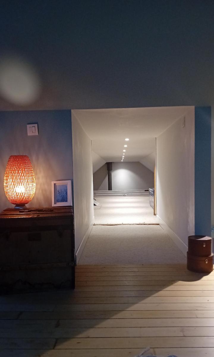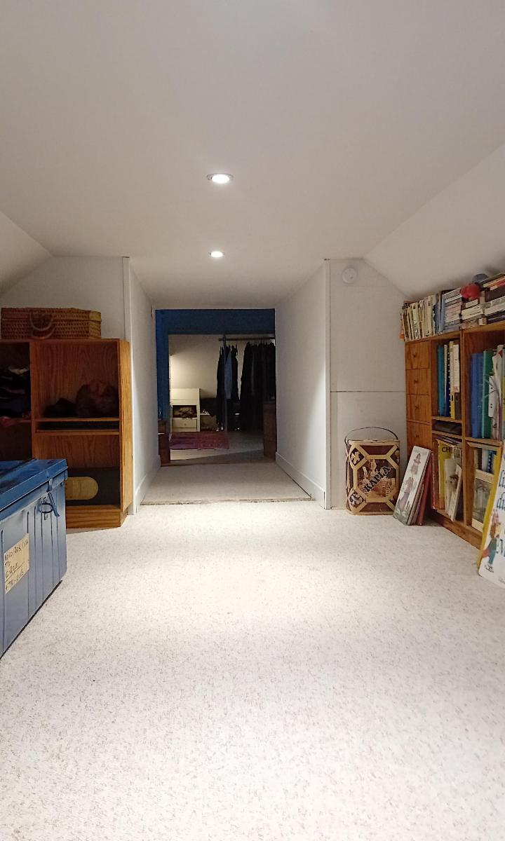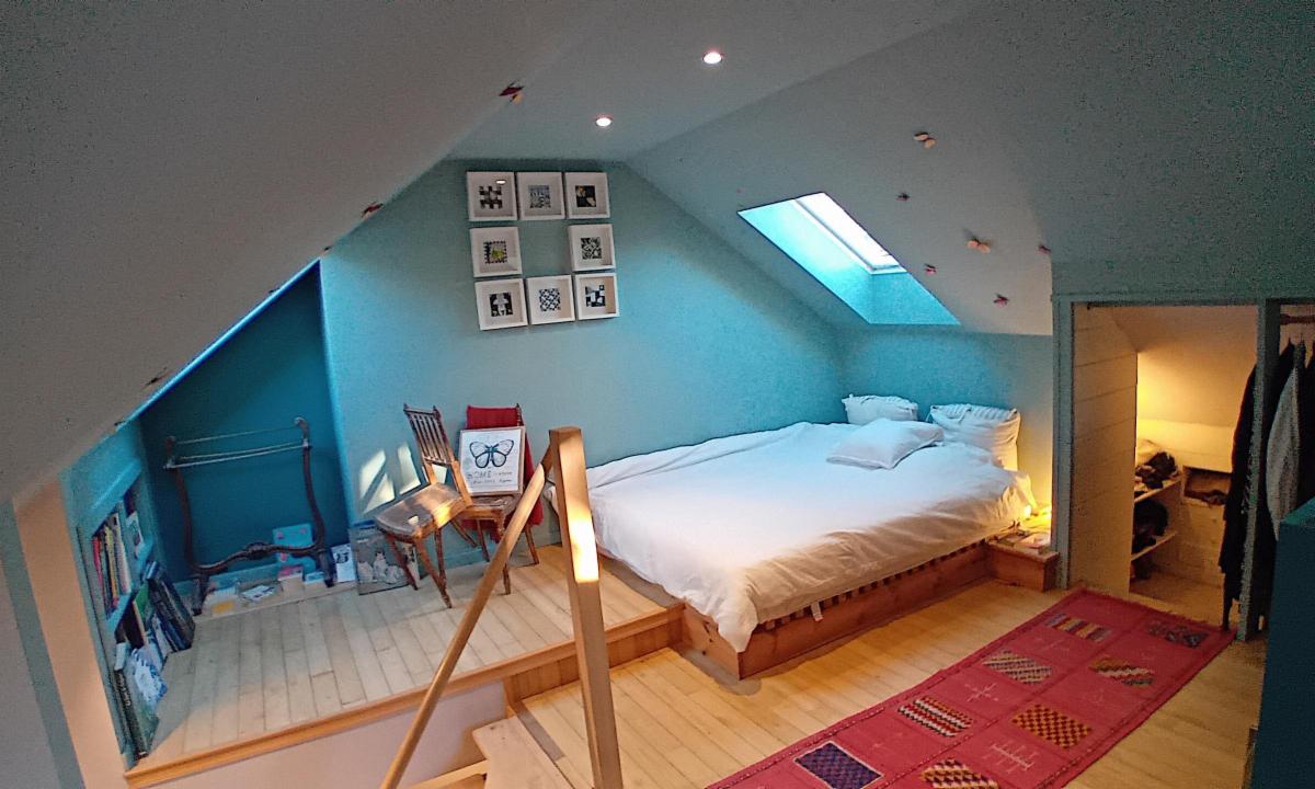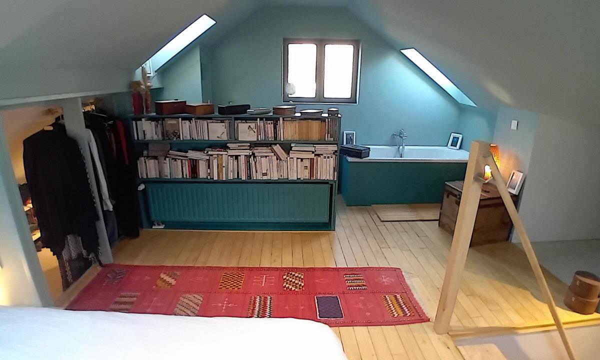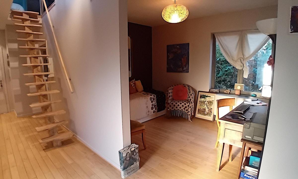 Le second duplex (à gauche) comprend un bureau, une salle de douche avec WC, une cuisine ouverte sur un salon / salle à manger disposant d'un poêle à bois. L'étage comprend un WC, une chambre avec baignoire ainsi qu'un grenier offrant un bel espace de rangement.