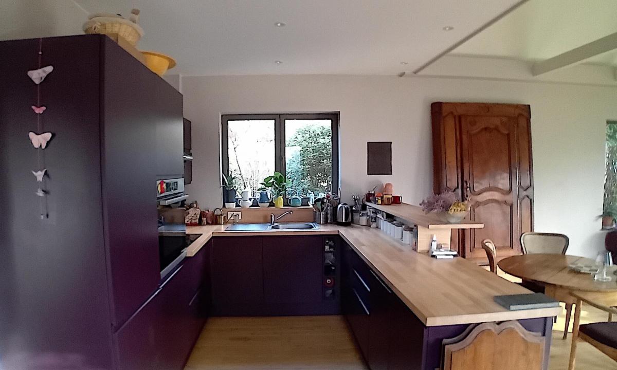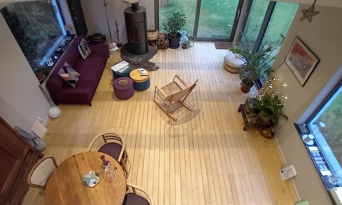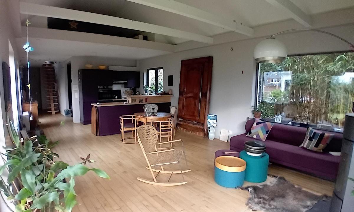 Le duplex de droite est composé : au rez-de-chaussée, une cuisine ouverte sur une salle à manger et un salon/coin TV (avec insert à bois), WC et rangement. L'étage comprend une salle de douche avec WC, une grande chambre lumineuse offrant une magnifique vue sur le jardin.