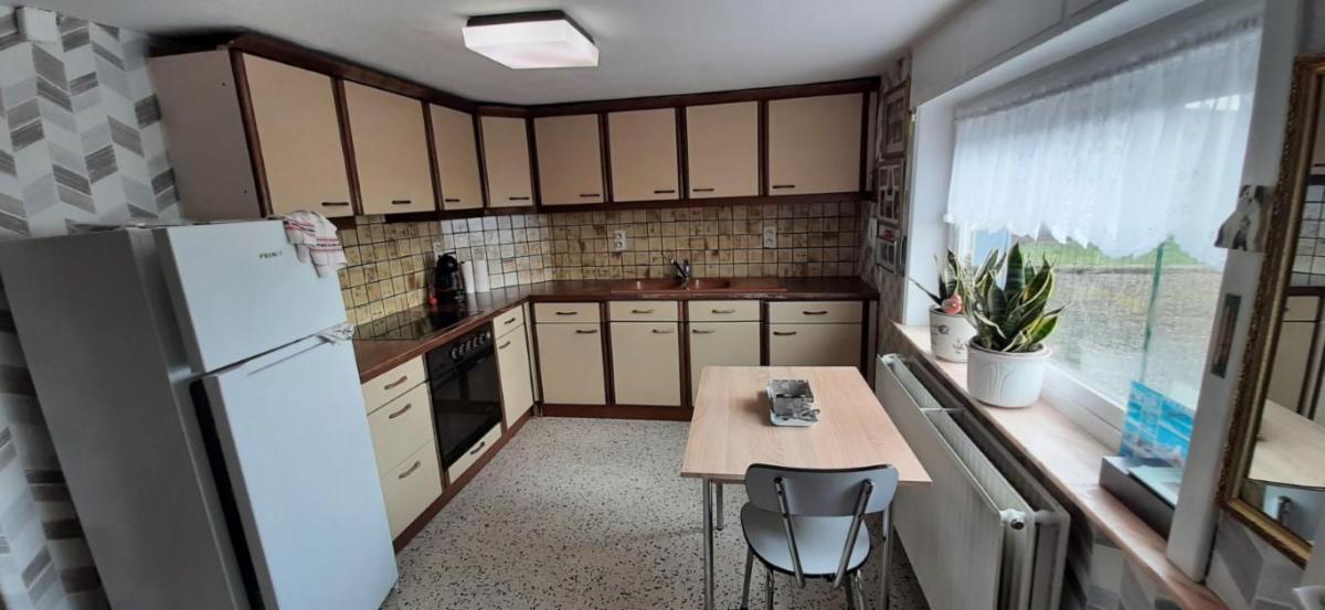 *au RDC: un hall, un salon-salle-à-manger avec cheminée et une cuisine semi-équipée (double évier, plaque vitrocéramique, four électrique, hotte et meubles en bois);