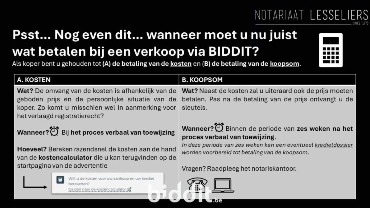 De fiche bekijken op Biddit.beHet goed zal door de kandidaat-kopers kunnen bezocht worden elke donderdag van 12u-15u, en dit vanaf donderdag 2 april 2026 tot en met donderdag 30 april 2026