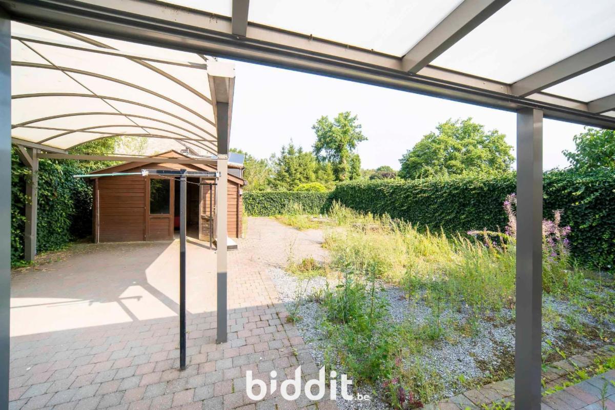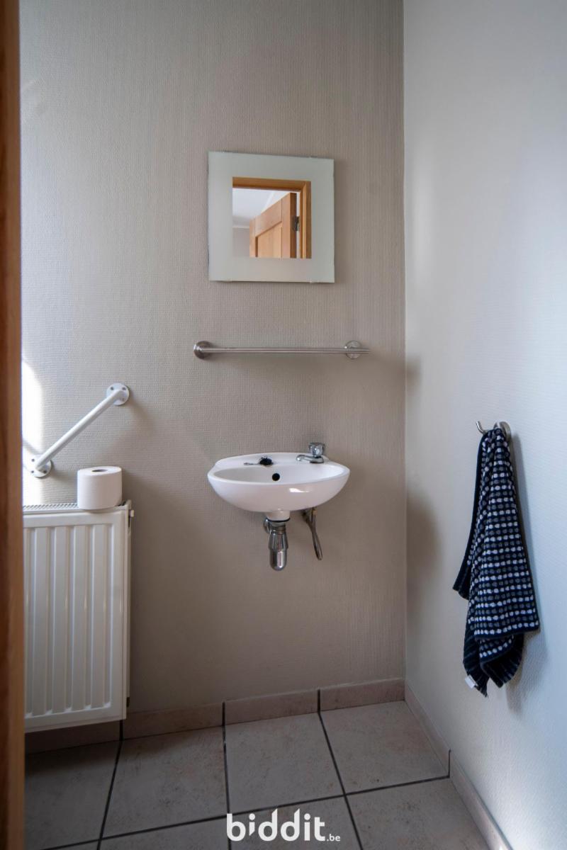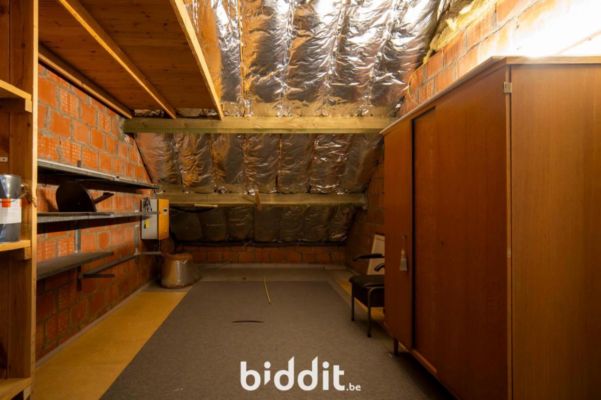 Gelijkvloerse verdieping: hall, WC, ruime living, geïnstalleerde keuken, trap naar boven met traplift, inpandige garage voor 1 auto met elektrische poort (met berging en aansluiting voor wasmachine, overdekt terras, carport, ruim tuinhuis, ruime open berging.