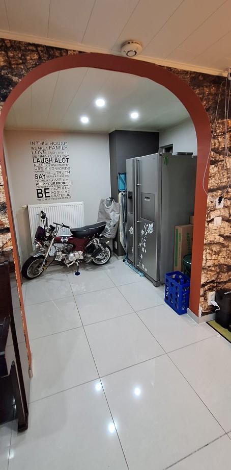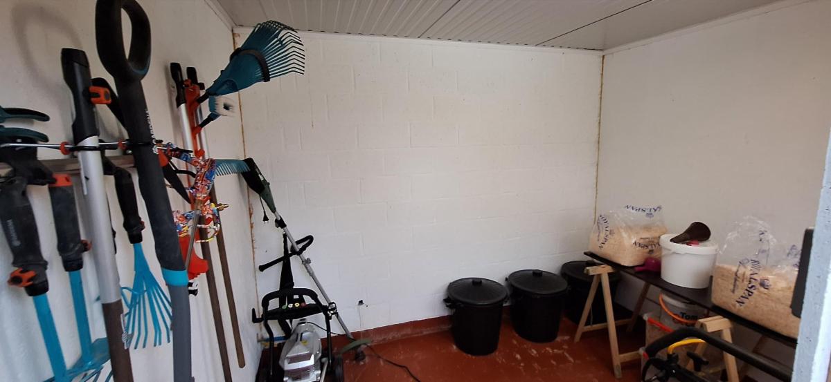 Indeling gelijkvloers: inkomhal, woonkamer met berging, ruime leef keuken met schuifdeuren naar afgesloten terras, washok, badkamer met ligbad, toilet en dubbele lavabo. Aparte berging(12m²) met deur naar buiten.
