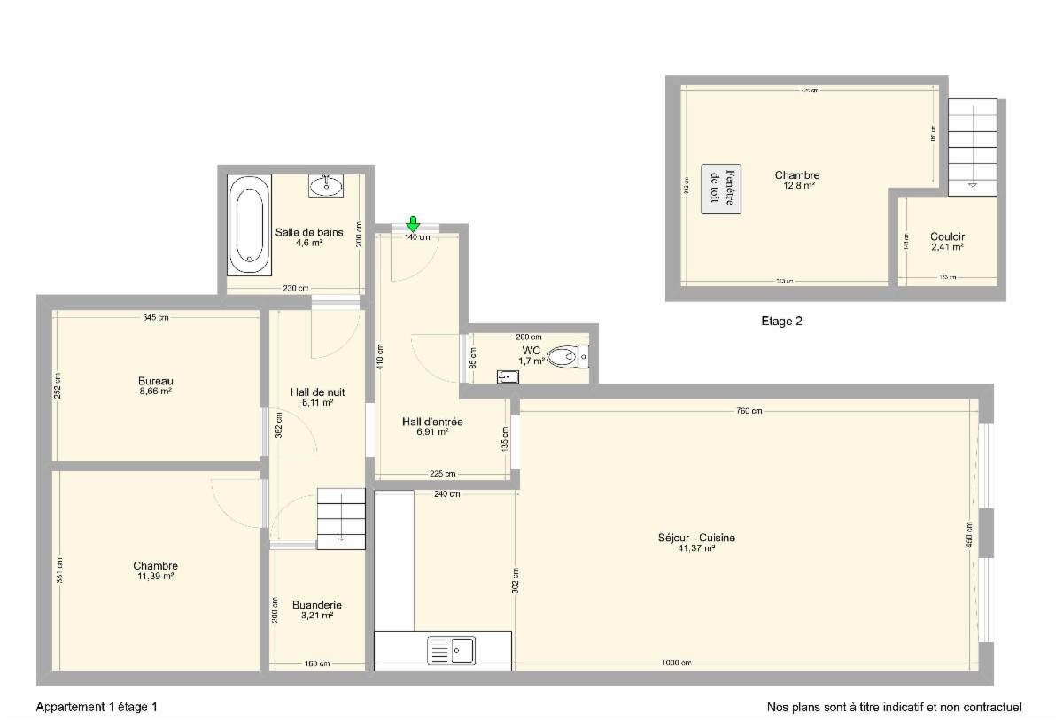 • Appartement 1 : bureau, deux chambres, hall d’entrée, cuisine équipée, buanderie, séjour/salon, salle de bains et WC séparé.
