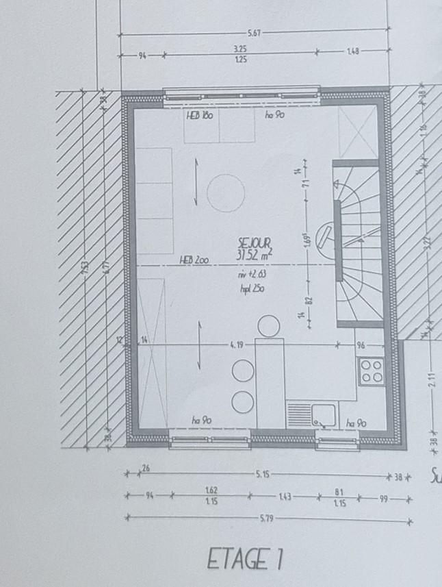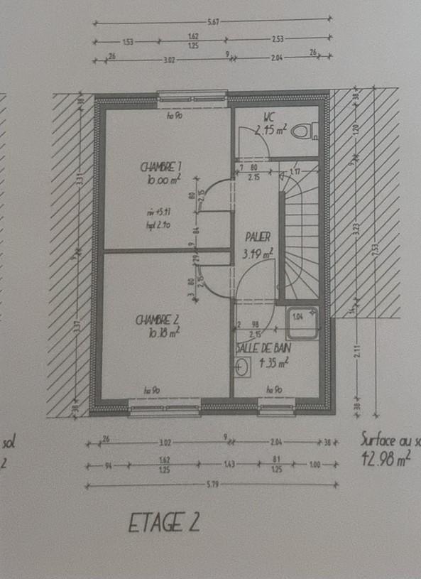Composition: NIV 0: garage (18,75m²), buanderie (7,41m²) et hall d'entrée (6,62m²). NIV+1: séjour ouvert avec coin cuisine, salon et salle à manger à aménager (31,52m²). NIV +2: palier (3,49m²), WC (2,45m²), 2 chambres à coucher (10 et 10,18m²) et une salle de bains (4,35m²).