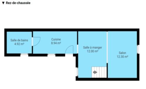 Rez-de-chaussée : salon, salle à manger, cuisine, salle de bain