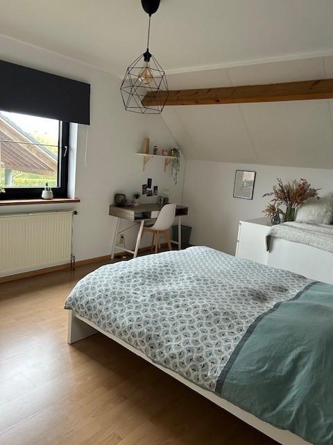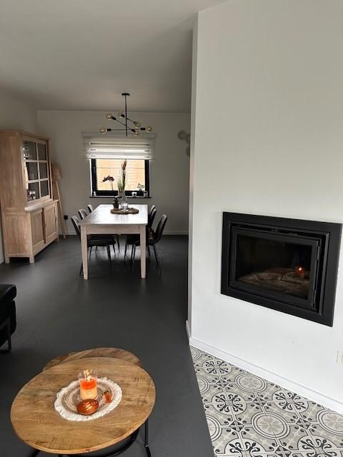 2° tussenverdieping: open keuken met werk/eeteiland, ingebouwde oven, magnetron, koelkast, vaatwasser, fornuis,...; leefruimte/eetplaats met ingebouwde cassettekachel, vloerverwarming; badkamer 2 met inloopdouche, wc en dubbele lavabo; slaapkamer 2 met trap naar mezzanine slaapkamer 3/tv-kamer.