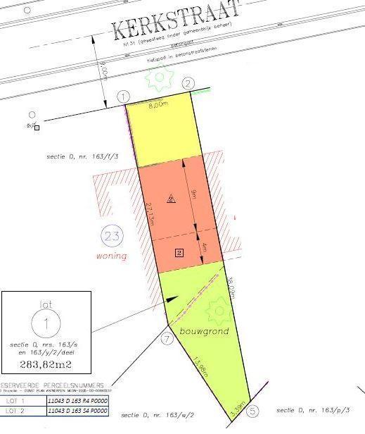 Perceel bouwgrond van 284m² gelegen aan de Kerkstraat te Sint-Lenaarts geschikt voor gesloten bebouwing. Perceel heeft een breedte van 8m en een diepte van 38m. Beknopte stedenbouwkundig voorschriften: bestemming: eengezinswoning met maximale bouwdiepte van 13m zoals aangeduid op het plan. Kroonlijsthoogte maximaal 9m, dezelfde als die van de aanpalende woning. Maximale nokhoogte maximaal 11m, in overeenstemming met het aanpalende gebouw. Dakuitvoering: tot op een diepte van 9m zadeldak met eenzelfde helling als van het aanpalend dak. Overige bouwdiepte: plat dak. Ondergronds bouwen is toegestaan, enkel onder de zone voor hoofdgebouwen en mits er geen negatief effect ontstaat op de waterhuishouding. Een veranda is mogelijk binnen de maximale bouwzone van het hoofdgebouw zoals weergegeven op het plan. Terrassen van maximum 20m² aansluitend aan de woning. Verharding in de voortuinstrook: noodzakelijke verharding voor de oprit naar een vergunde garage, car-port of parking breedte maximaal 3m + noodzakelijke verharding voor de toegang tot de woning van maximaal 1m. Bijgebouwen: een tuinhuis van 12m² is toegelaten op het perceel. Vraagprijs: €159.000 P score: A