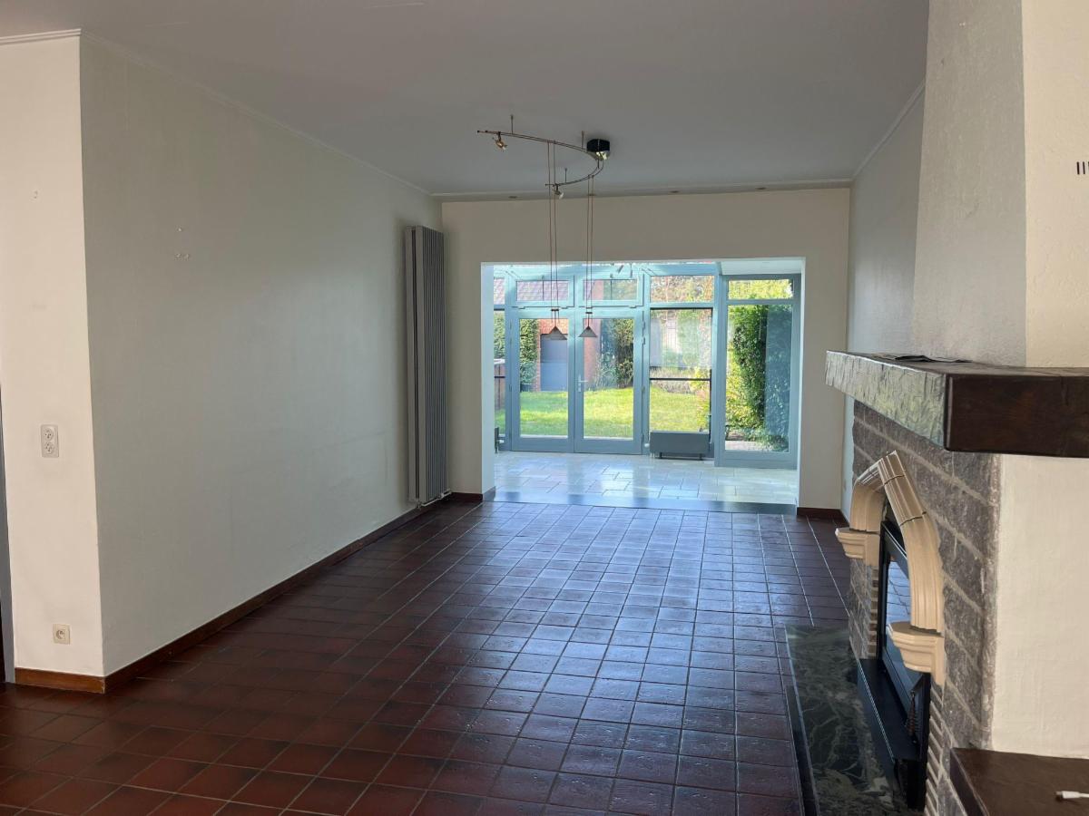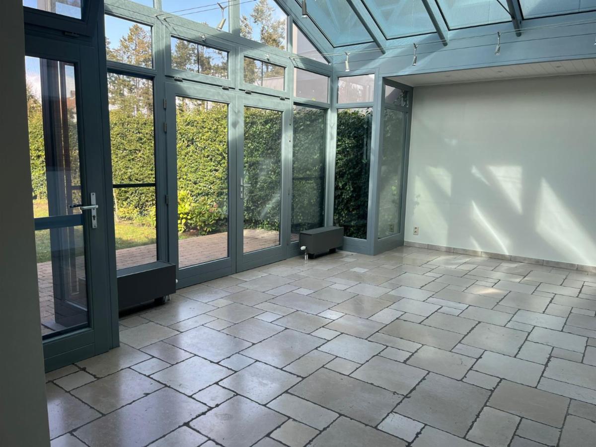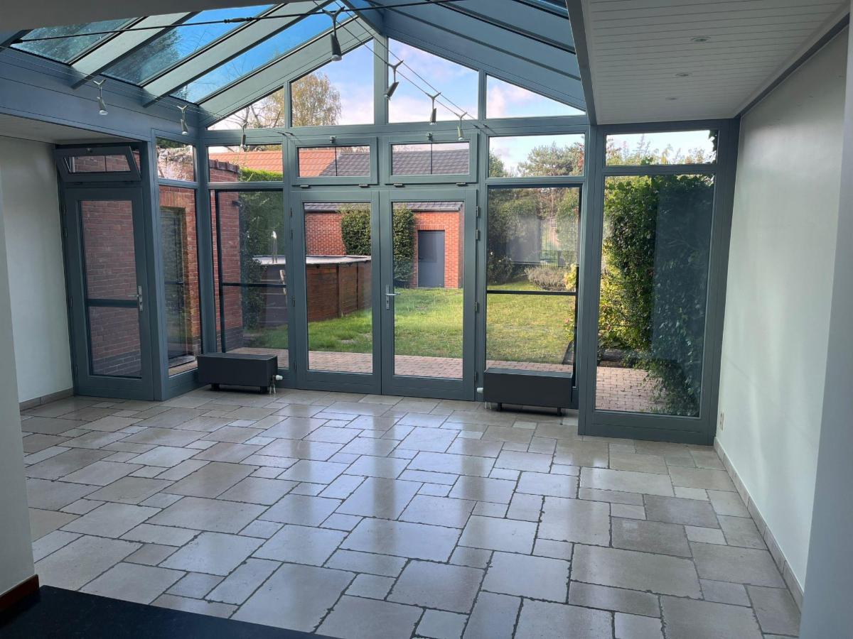 Vanuit de woonkamer loopt men door in de leef-veranda op tegelvloer met Romeins motief. Deze is voorzien van verwarming en dubbele deur naar terras en tuin. Achteraan de tuin is er een afzonderlijke garage, te bereiken via het achter gelegen straatje. Aan het terras is er nog een handige tuinberging voorzien.