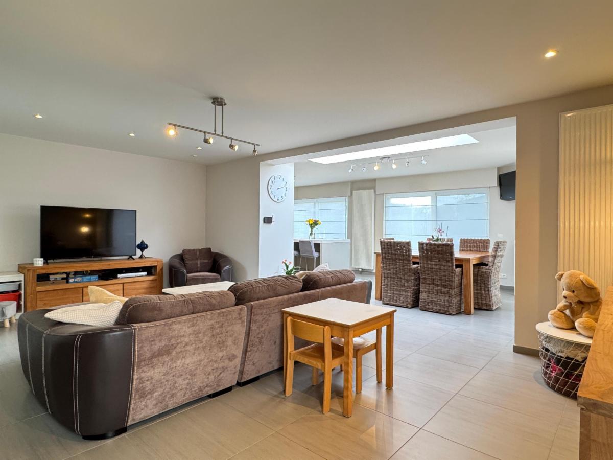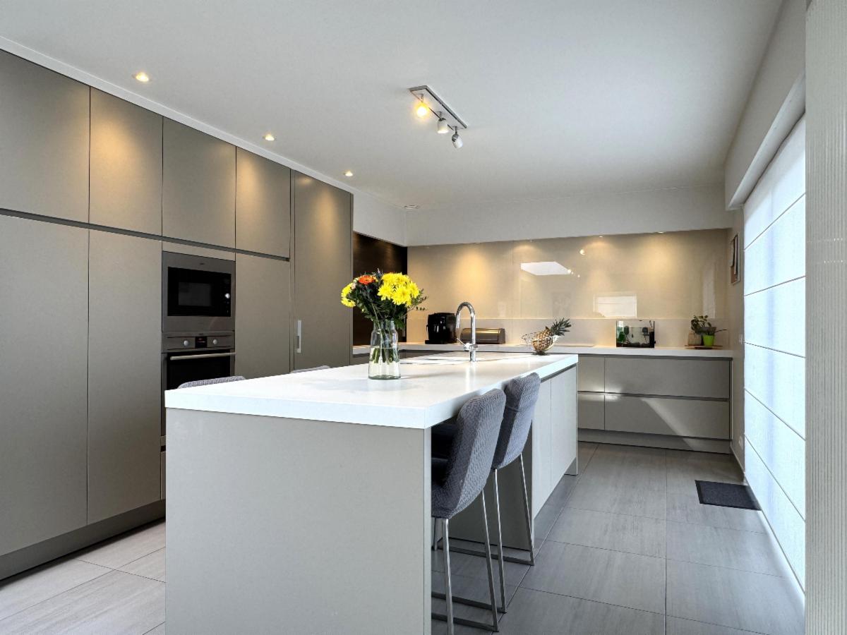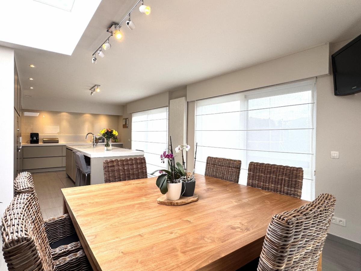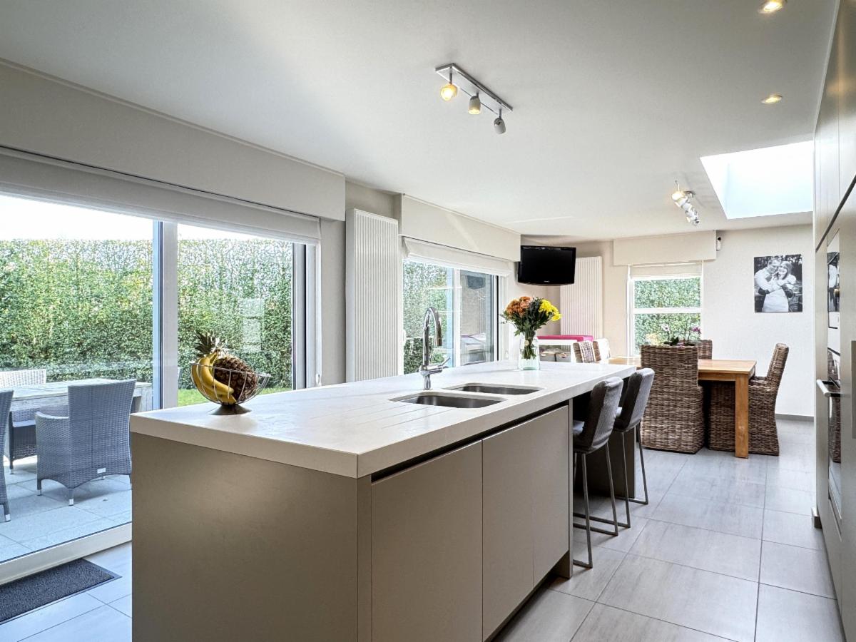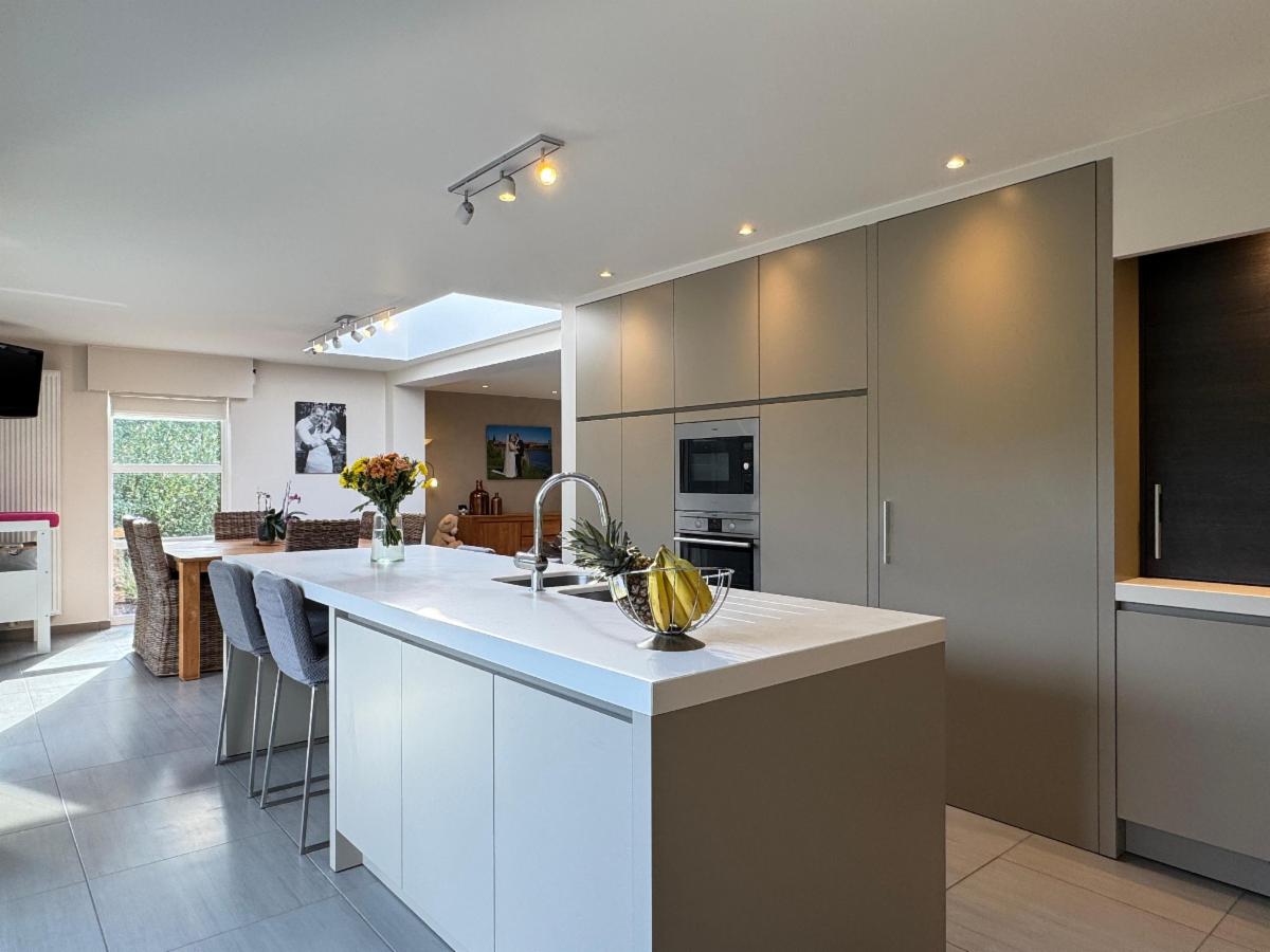 Ruime en lichtrijke living met eet-en zithoek, geïnstalleerde keuken met eiland (vaatwas, oven, micro-golf, inductie-kookplaat, dampkap "Novy"), wasplaats, bureau met ingemaakte kasten, slaapkamer beneden.