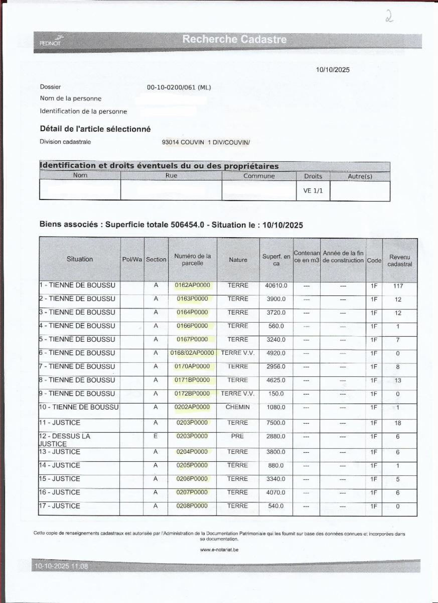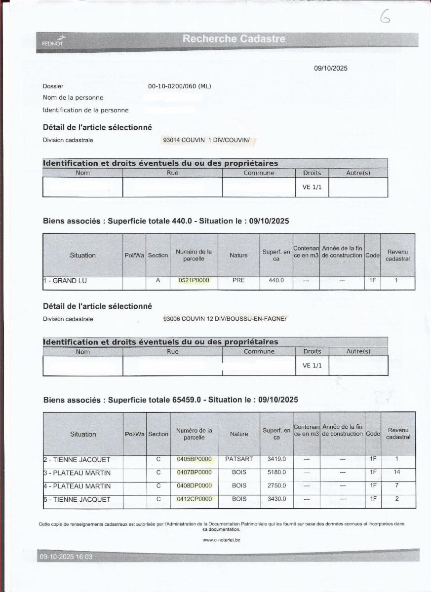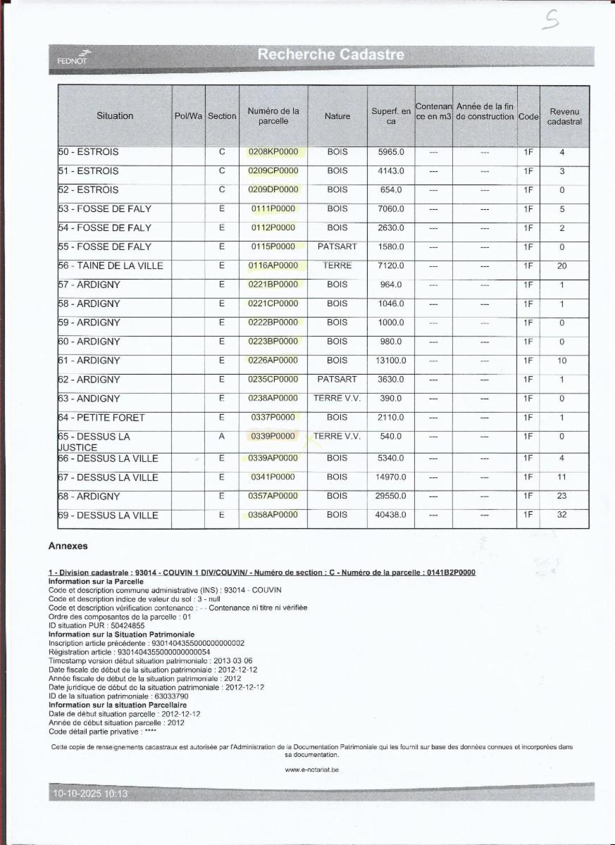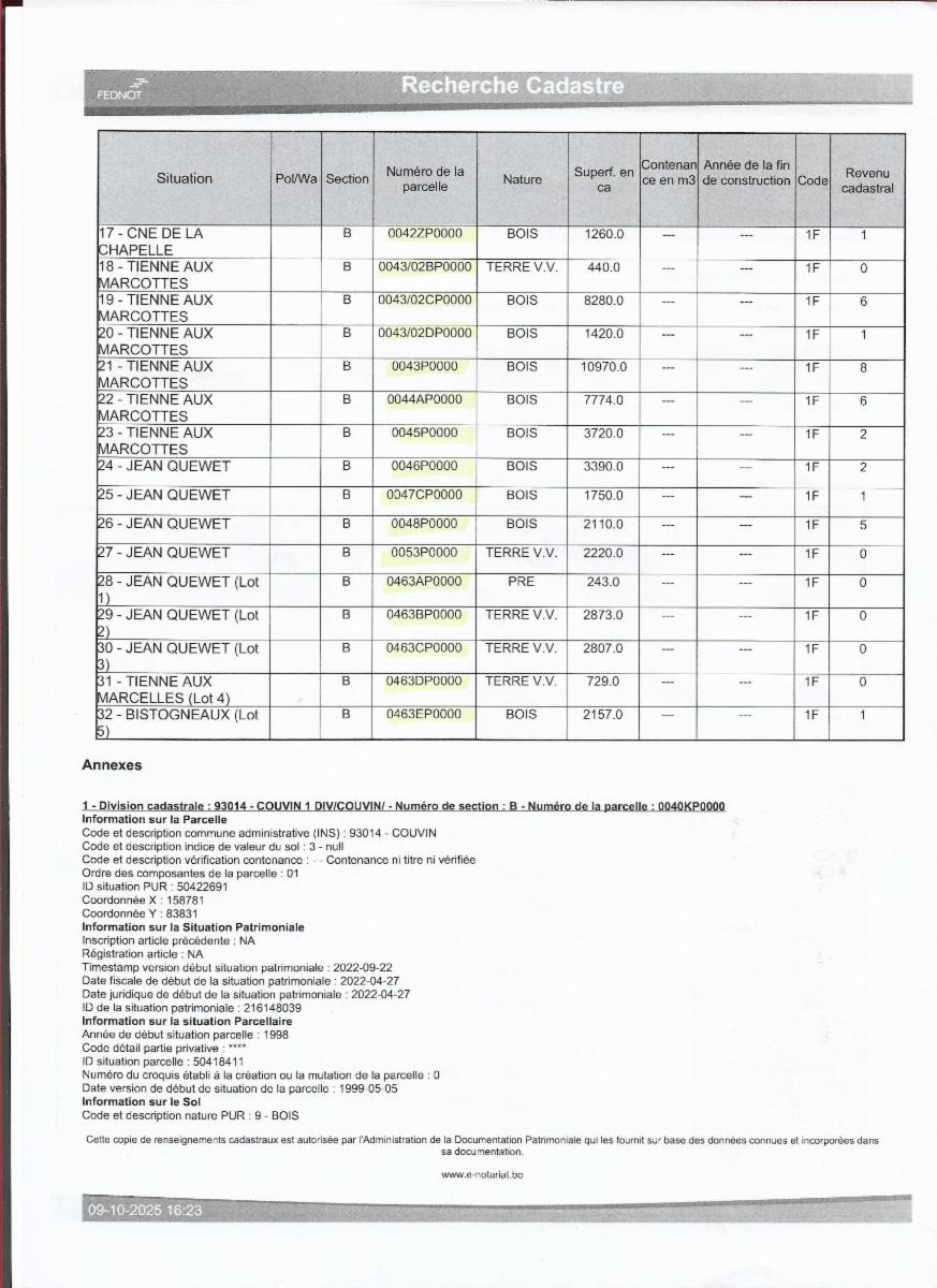Propriétés terriennes d’une contenance approximative totale de 50ha sur les communes de Couvin, Pesche et Boussu-en-Fagne : terres, patsarts, prés, pâtures, terres v.v., bois, bâtiments ruraux. Les parcelles agricoles sont pour la plupart occupées.