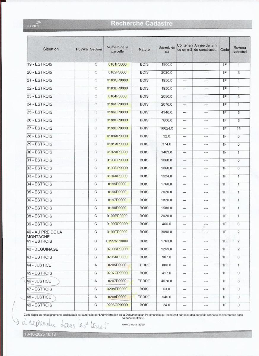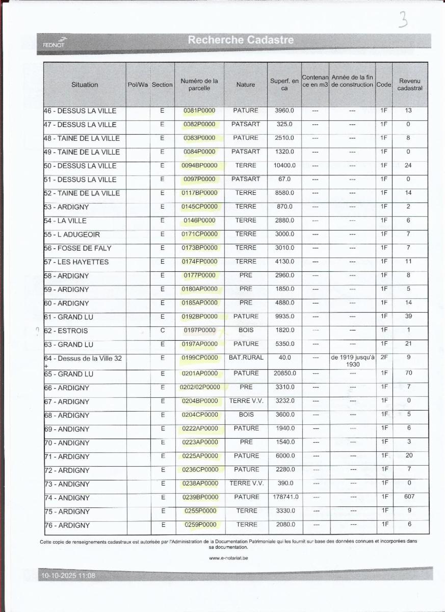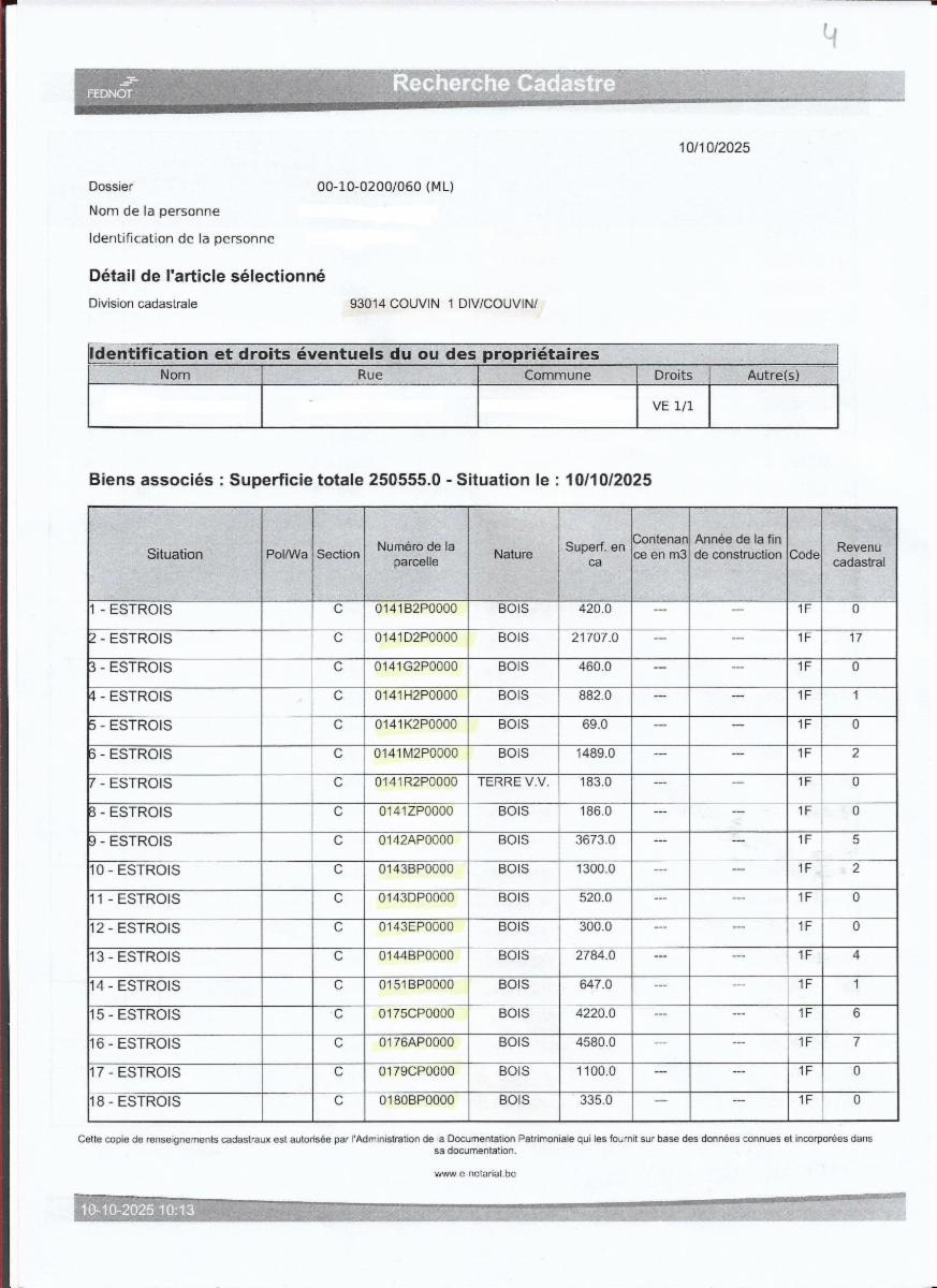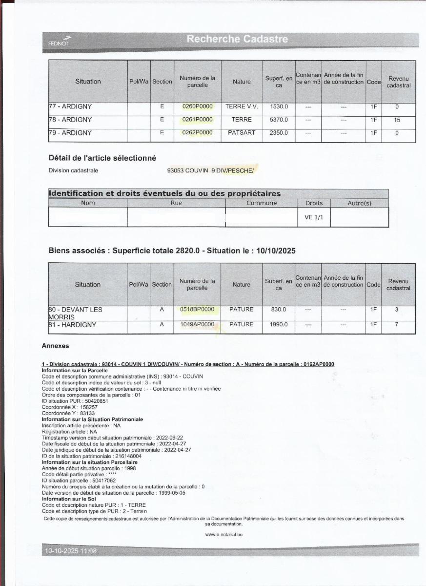 Propriétés terriennes d’une contenance approximative totale de 50ha sur les communes de Couvin, Pesche et Boussu-en-Fagne : terres, patsarts, prés, pâtures, terres v.v., bois, bâtiments ruraux. Les parcelles agricoles sont pour la plupart occupées.