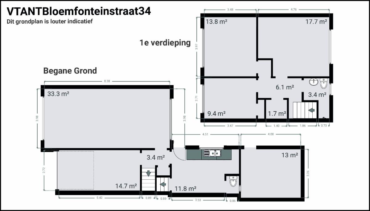 - Gelijkvloers: ruime oprit, inpandige garage (met elektrische poort), hal, eetkamer, woonkamer en keuken met toegang tot de tuin, berging en wc;