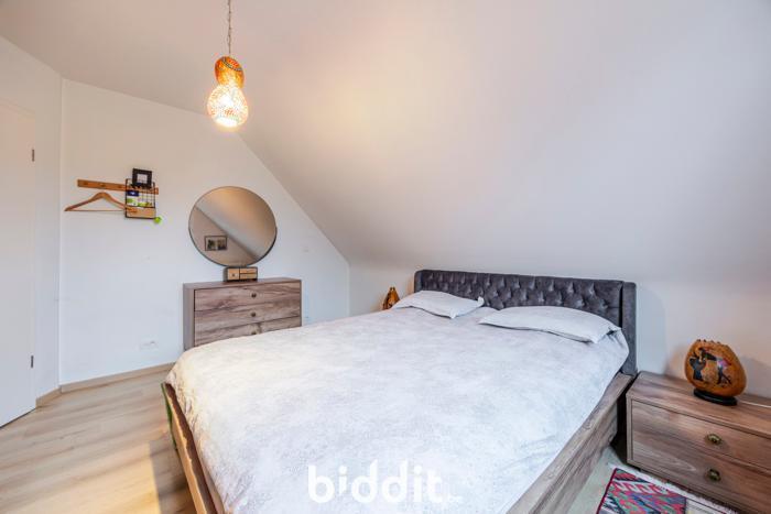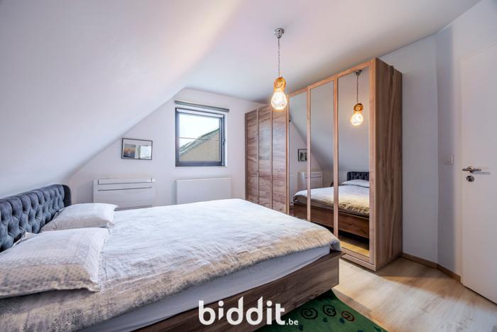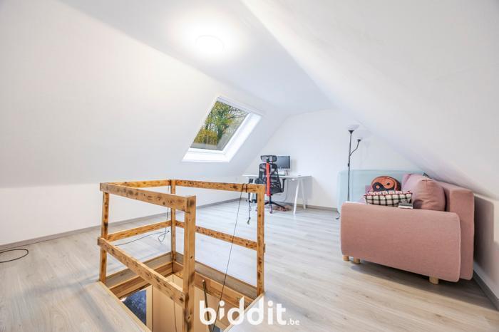 Op het gelijkvloers is er een inkomhal met gastentoilet, een open keuken met aangrenzend een ruime woonkamer met veel lichtinval. Directe toegang tot een ruim terras met uitzicht op groen. Op de eerste verdieping bevinden zich 3 slaapkamers en een badkamer met douche, 2 lavabo’s, toilet en ruimte voor het plaatsen van een wasmachine en droogkast. Ten slotte is er op de tweede verdieping een volledig afgewerkte zolderkamer die perfect kan dienen als extra slaapkamer, bureau of hobbyruimte.