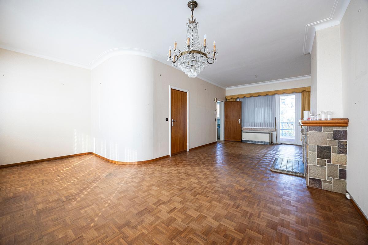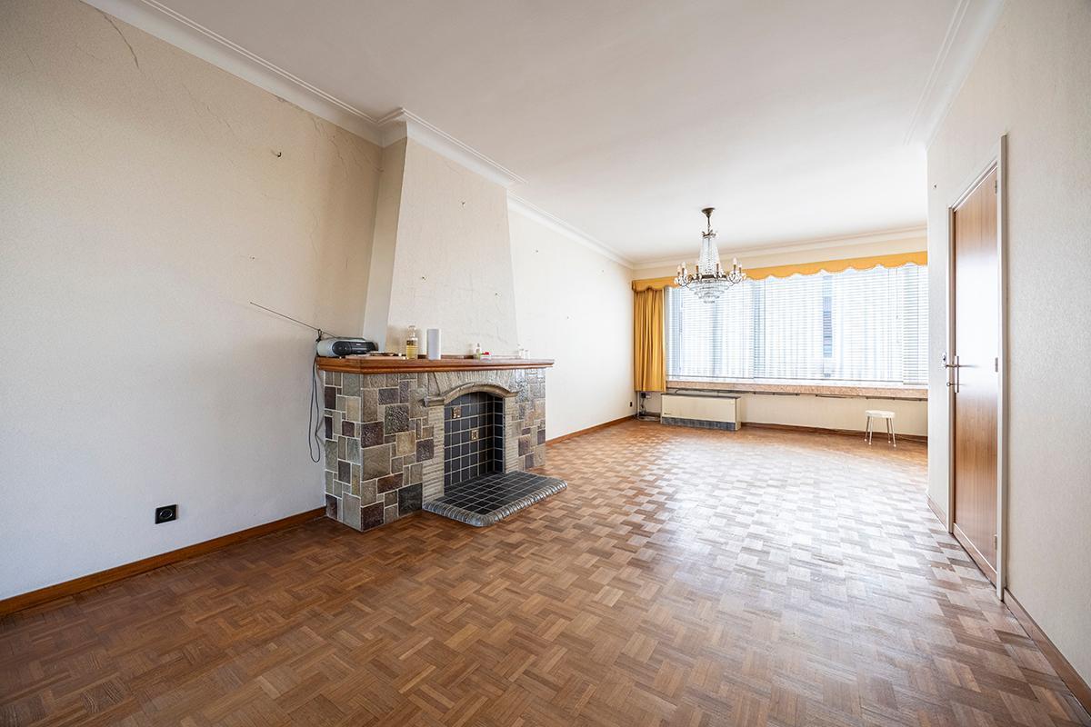 Op de 1e verdieping bevindt zich een ruime en lichte living die uitkomt op de eetkamer (samen 35m²) met prachtige parketvloer en sierhaard.