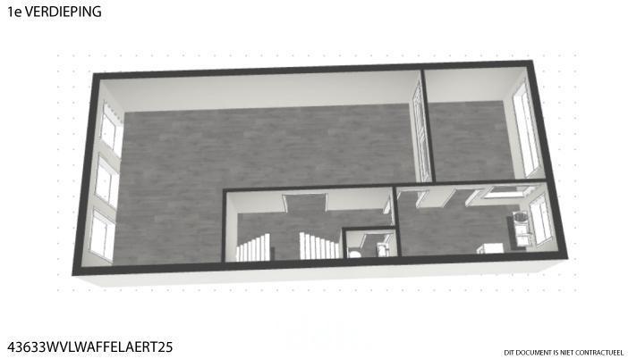 • Eerste verdieping: De ruime leefruimte geniet van grote raampartijen. Aansluitend vindt u de keuken en veranda. Via de hal is er toegang tot het toilet.