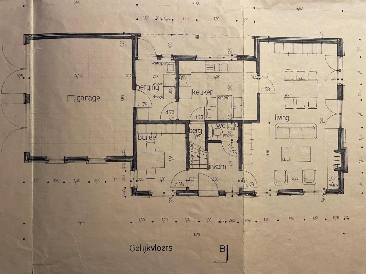 Indeling: living, keuken, bergplaats, inkom met apart toilet, bureelruimte;