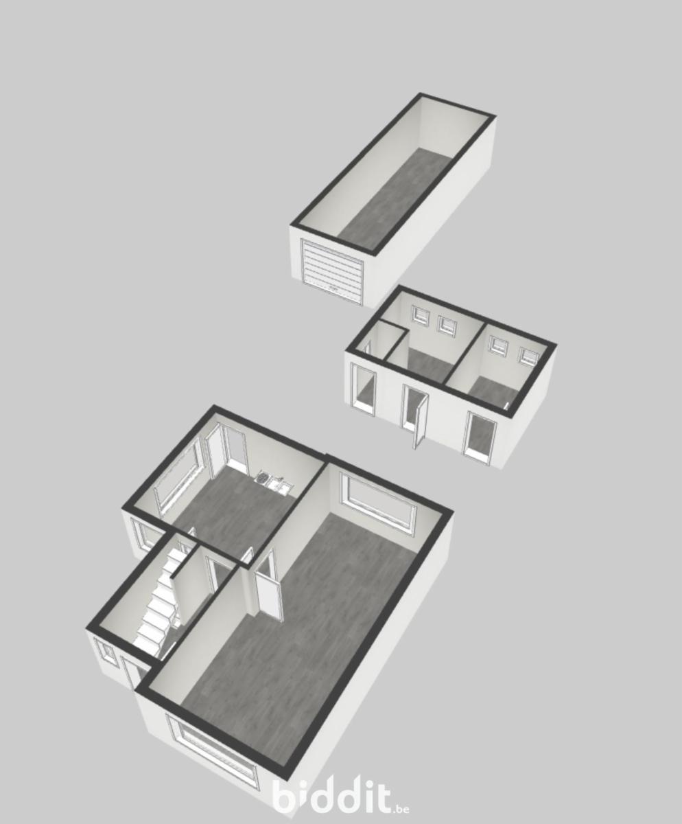 - gelijkvloers: inkomhal, keuken, woonkamer, eetplaats, berging, wasplaats, WC, veranda, garage en tuin,