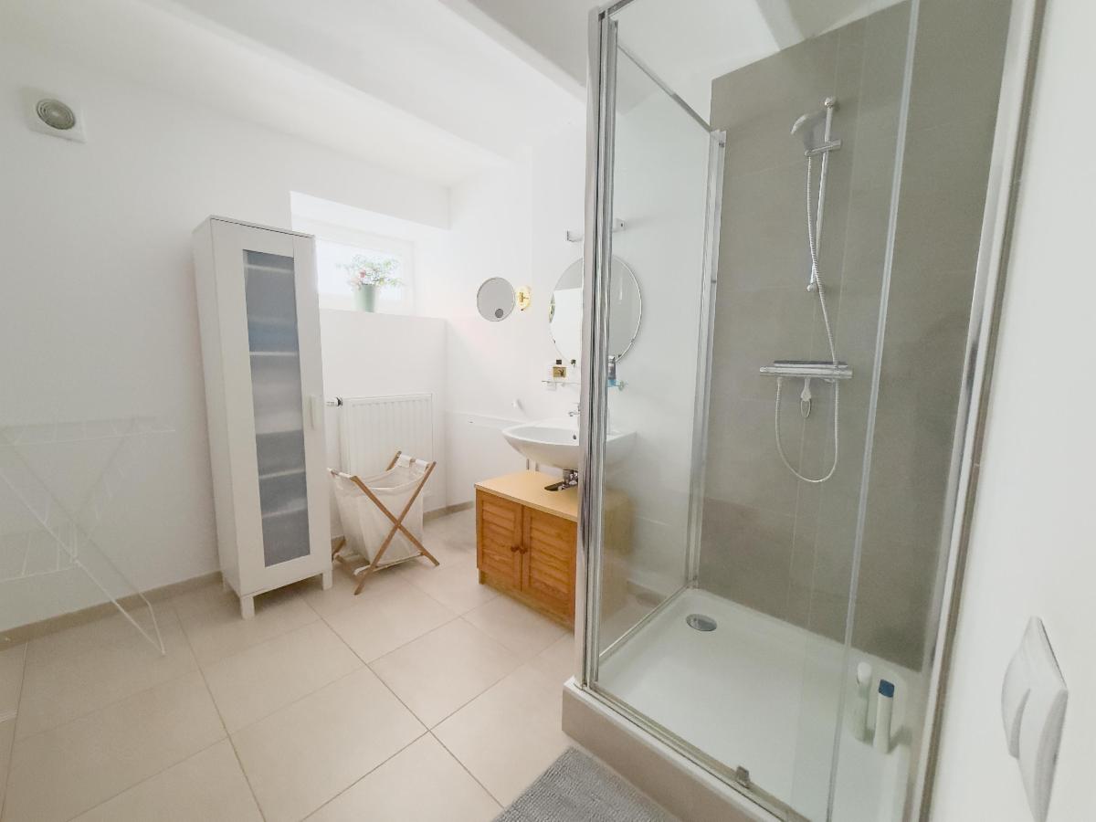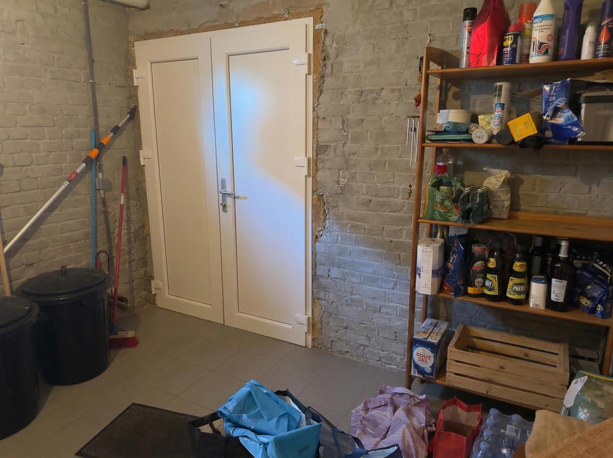 Au rez-de-chaussée, vous trouverez une remise d’environ 13 m² avec accès direct vers l’extérieur et les emplacements de parking, un couloir de distribution, une première chambre confortable d’environ 11,6 m², une salle de bains équipée d’une cabine de douche et d’une vasque, un WC séparé avec lave-mains ainsi qu’un hall avec cage d’escalier.