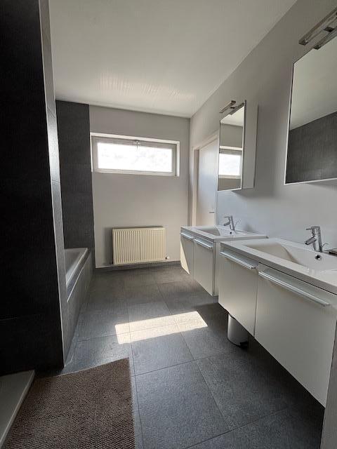Eerste verdieping: nachthal met apart toilet, 3 slaapkamers. Ruime moderne badkamer met ligbad, inloopdouche en dubbele lavabo en een tweede (!) badkamer met douche en lavabo. Ideaal voor een vlot ochtendritueel. De grote badkamer geeft toegang tot een dressingruimte.