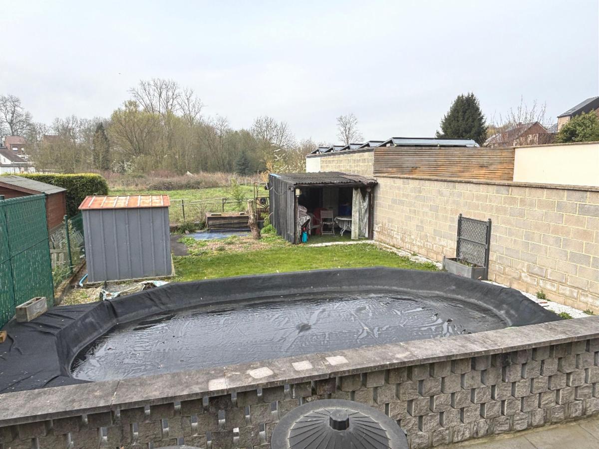 Rez : avant cour, hall d’entrée (+placard), living avec insert au gaz, belle cuisine équipée, terrasse, jardin avec petite piscine fonctionnelle non chauffée, accès cave de l’extérieur, chaudière récente gaz.