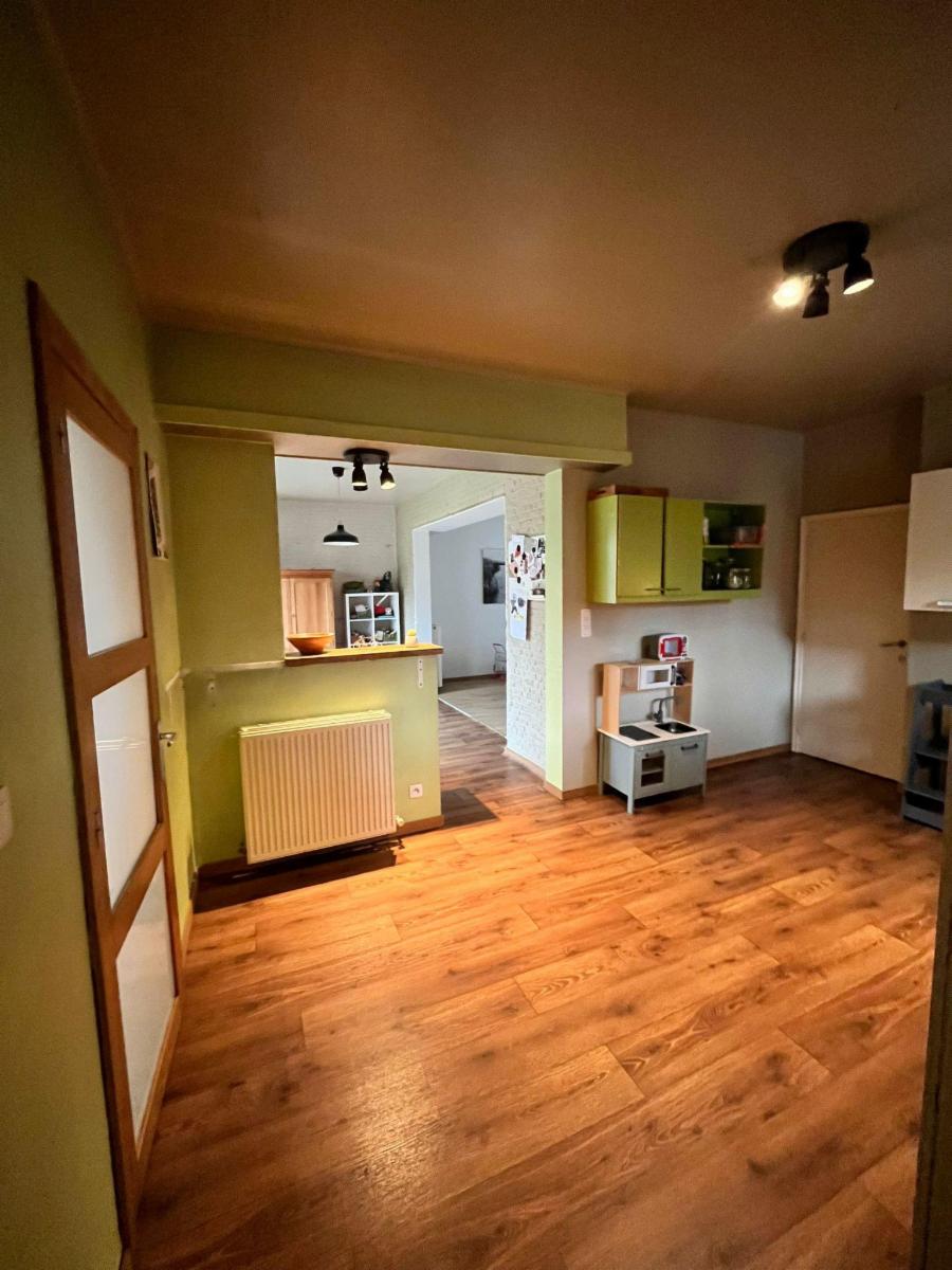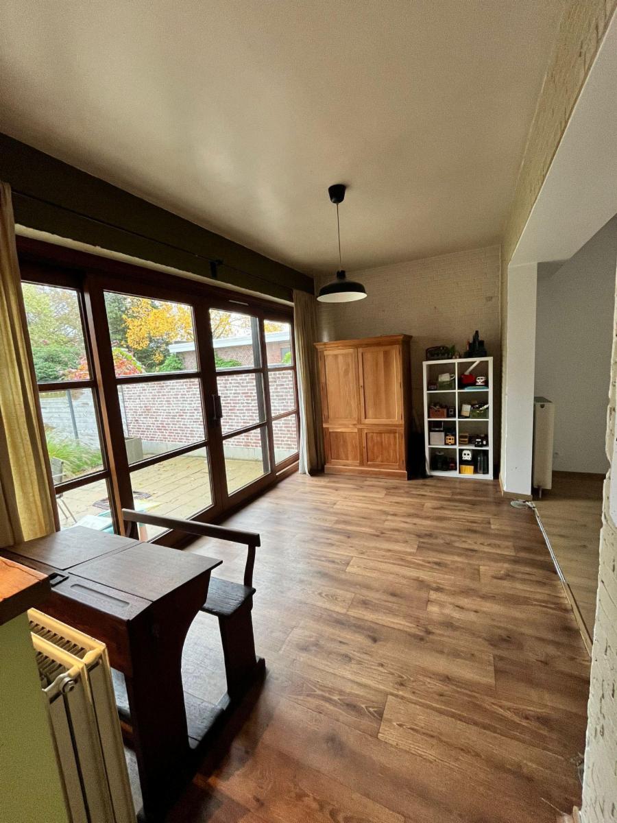 Op het gelijkvloers is een inkomhal met traphal aanwezig, een ruime woonkamer met natuurlijk licht. Aansluitend bevindt zich een gezellige ruimte met zicht op de tuin, die in verbinding staat met de keuken. Verder is er een berging en een badkamer met bad, douche, dubbele wastafel en toilet.