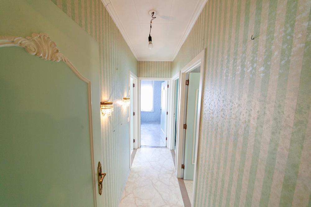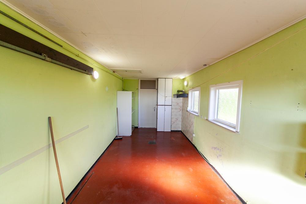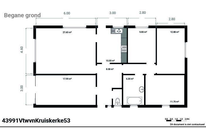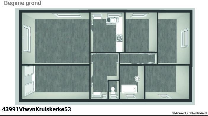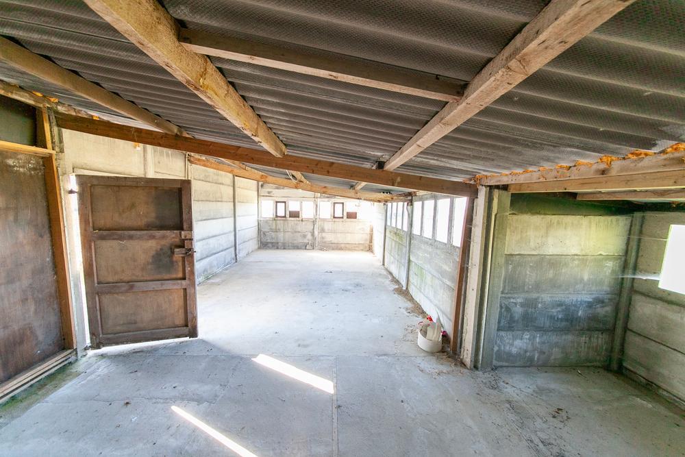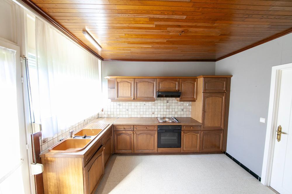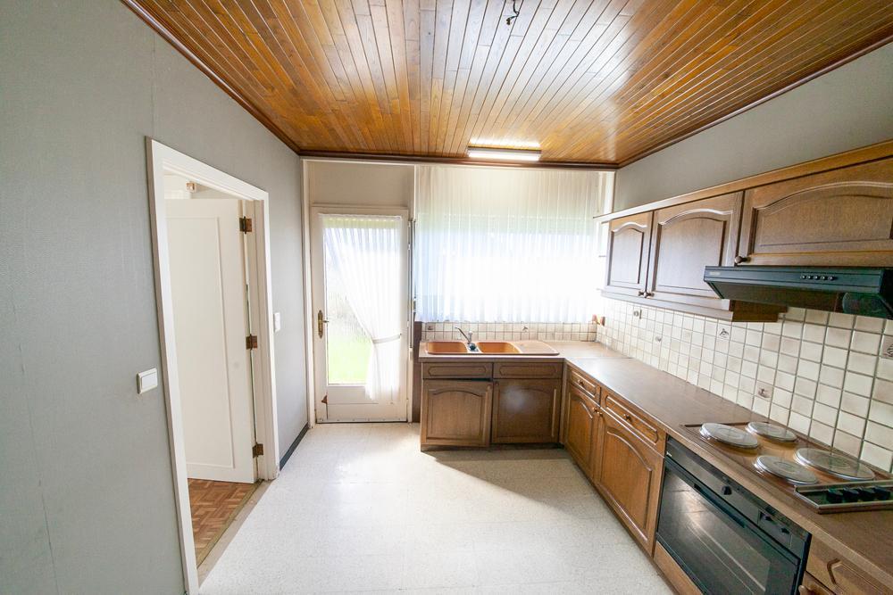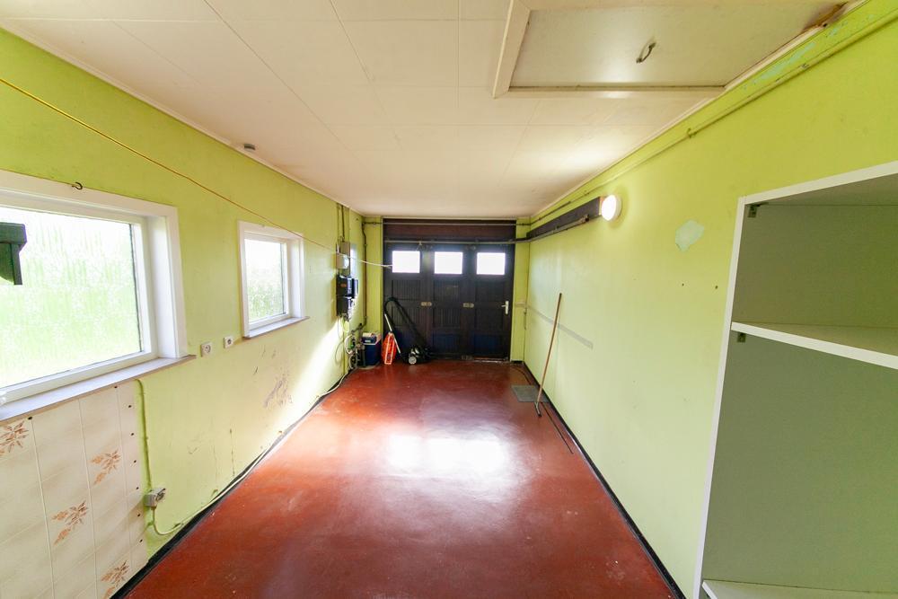 Keuken, living, hal met toilet, één badkamer en drie slaapkamers, inpandige garage, zolder, tuin.