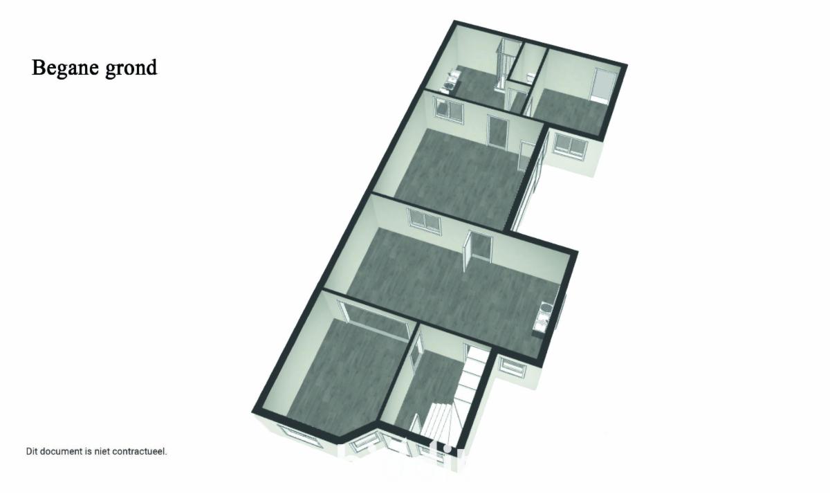 Gelijkvloers: hal, woon- en eetkamer, keuken, veranda, bergruimte, wasruimte.