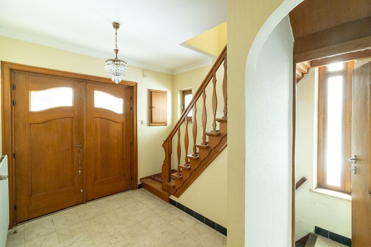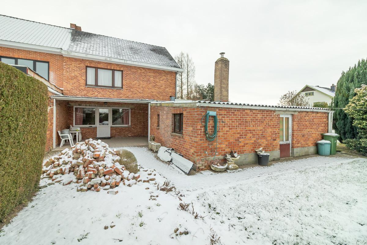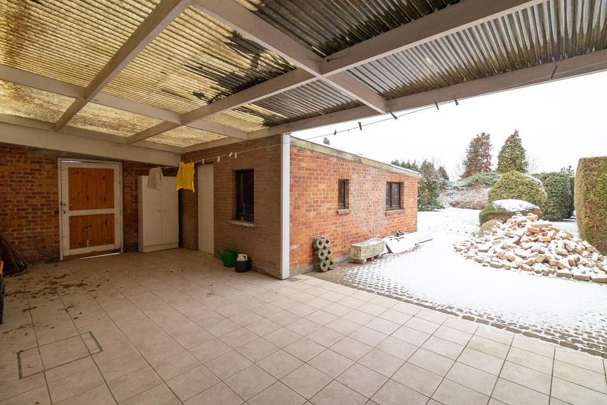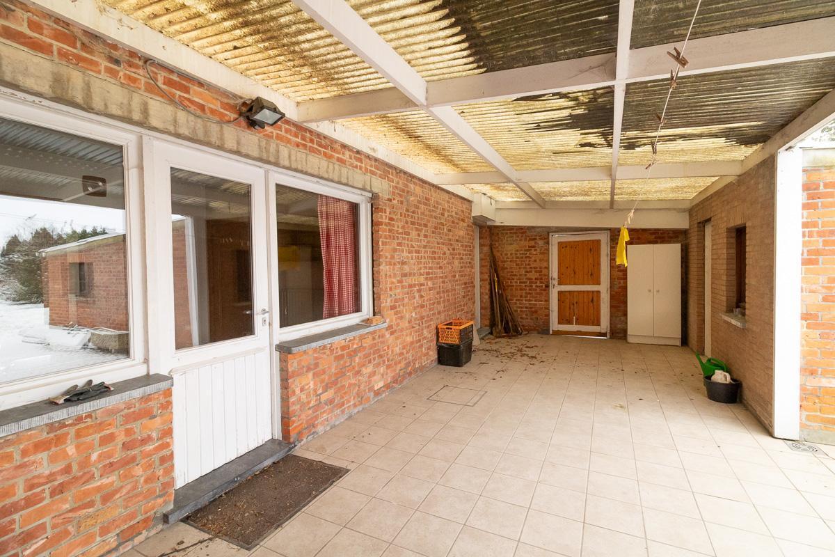 Gelijkvloers: inkomhal, keuken, living met eetruimte, open veranda-koer, stallingen met toilet.