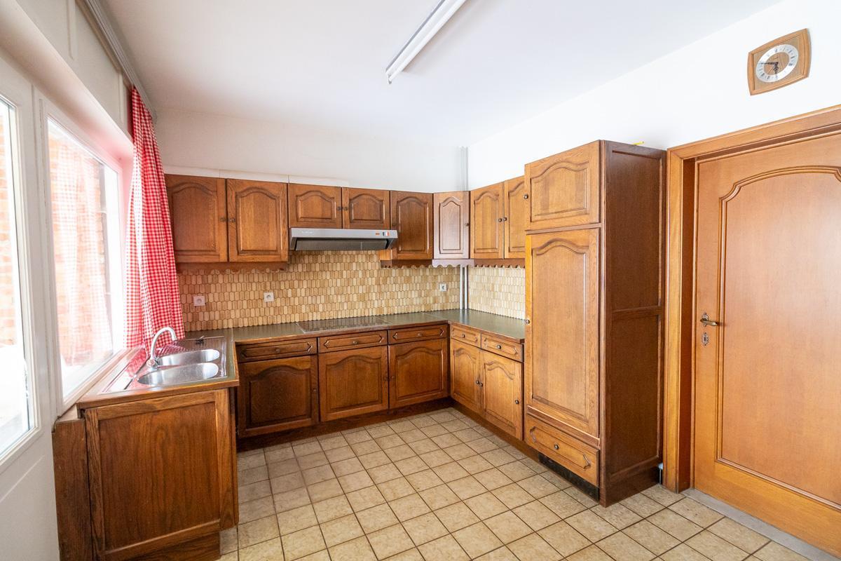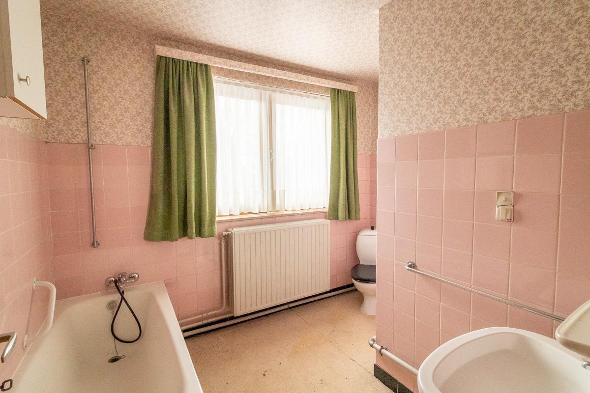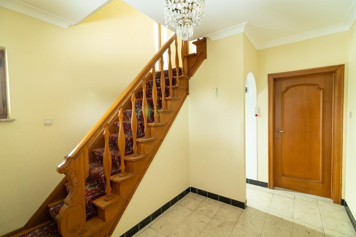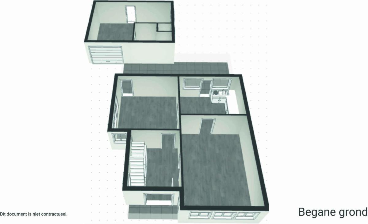 Gelijkvloers: inkomhal, keuken, living met eetruimte, open veranda-koer, stallingen met toilet.
