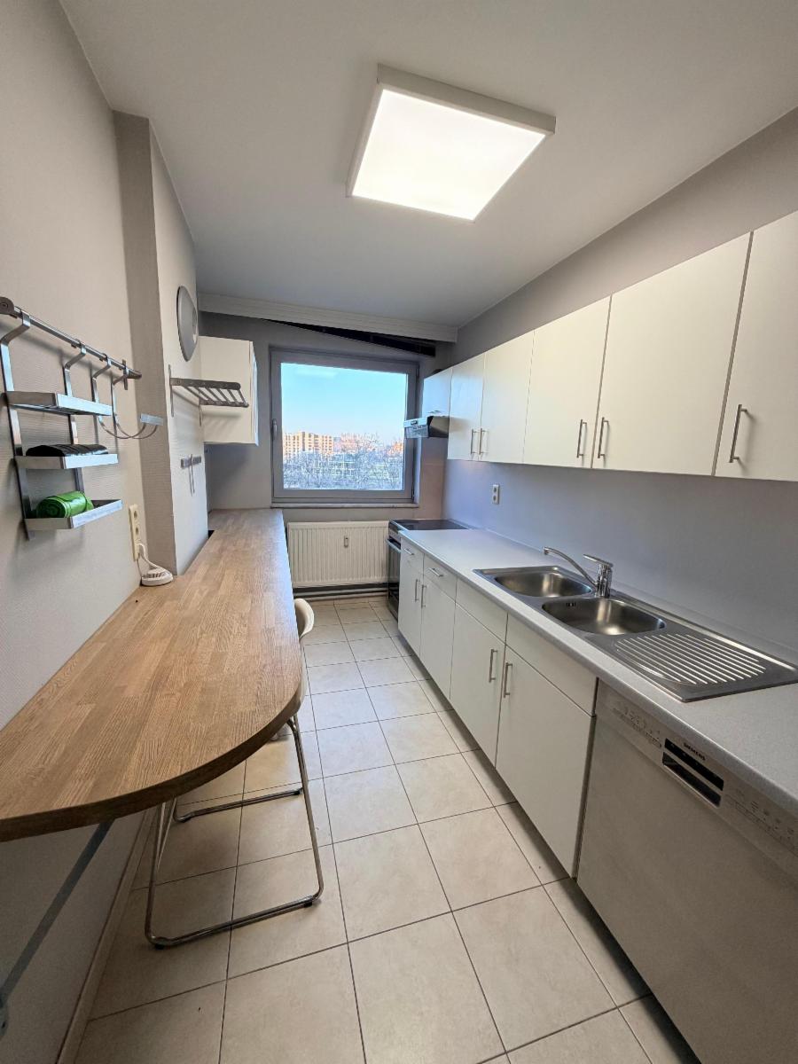Au 7e étage d'une résidence, avec une vue dégagée à 180°, très bel appartement contemporain composé d'un grand hall d'entrée avec vestiaire et armoire, d'un vaste séjour lumineux, d'une cuisine full équipée, d'un hall de nuit avec armoires encastrées, un wc avec lave-main, de deux chambres avec accès à la terrasse (arrière), d'une buanderie et d'une salle de bain. Au sous-sol : une cave. Accès sécurisés (double sas au rez-de-chaussée, ascenseur sécurisé, porte blindée). Parlophone. La situation est exceptionnelle à l'entrée/sortie de la ville, à 150 mètres d'un arrêt de tram et de bus, à 450mètres de la Gare des Guillemins, à 800 mètres de l'accès à l'autoroute et tous les commerces à quelques pas (pharmacies, grandes surfaces, boulangerie). Châssis double vitrage (PEB : B !)