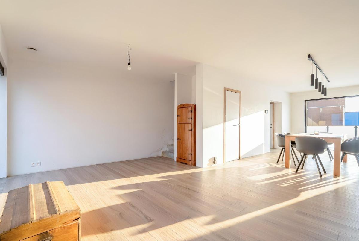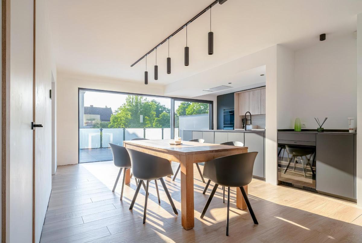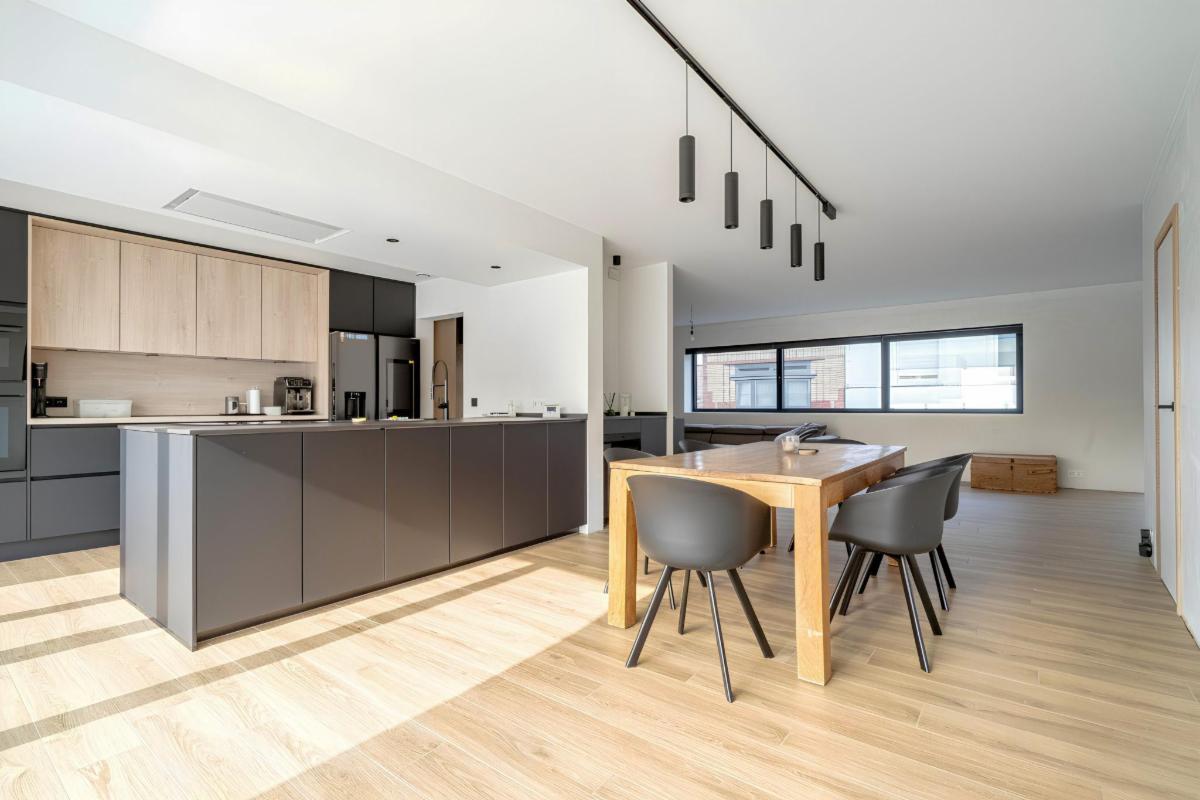Au 1er : un WC, une vaste cuisine de qualité complètement équipée comprenant notamment un cellier électrique (wine cooler), un vaste salon-salle à manger traversant garni de grès céram, type « parquet à l'ancienne », avec accès à une terrasse équipée d’un store banne électrique par une baie vitrée, un local technique.