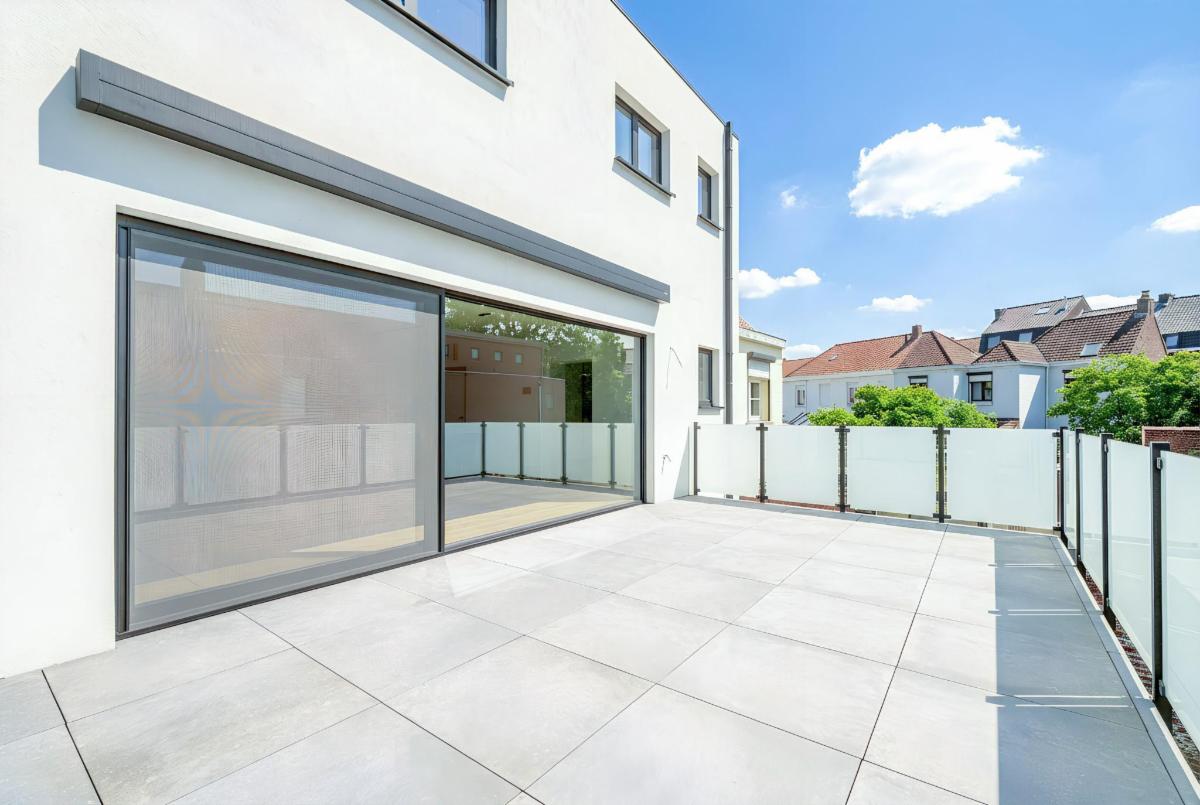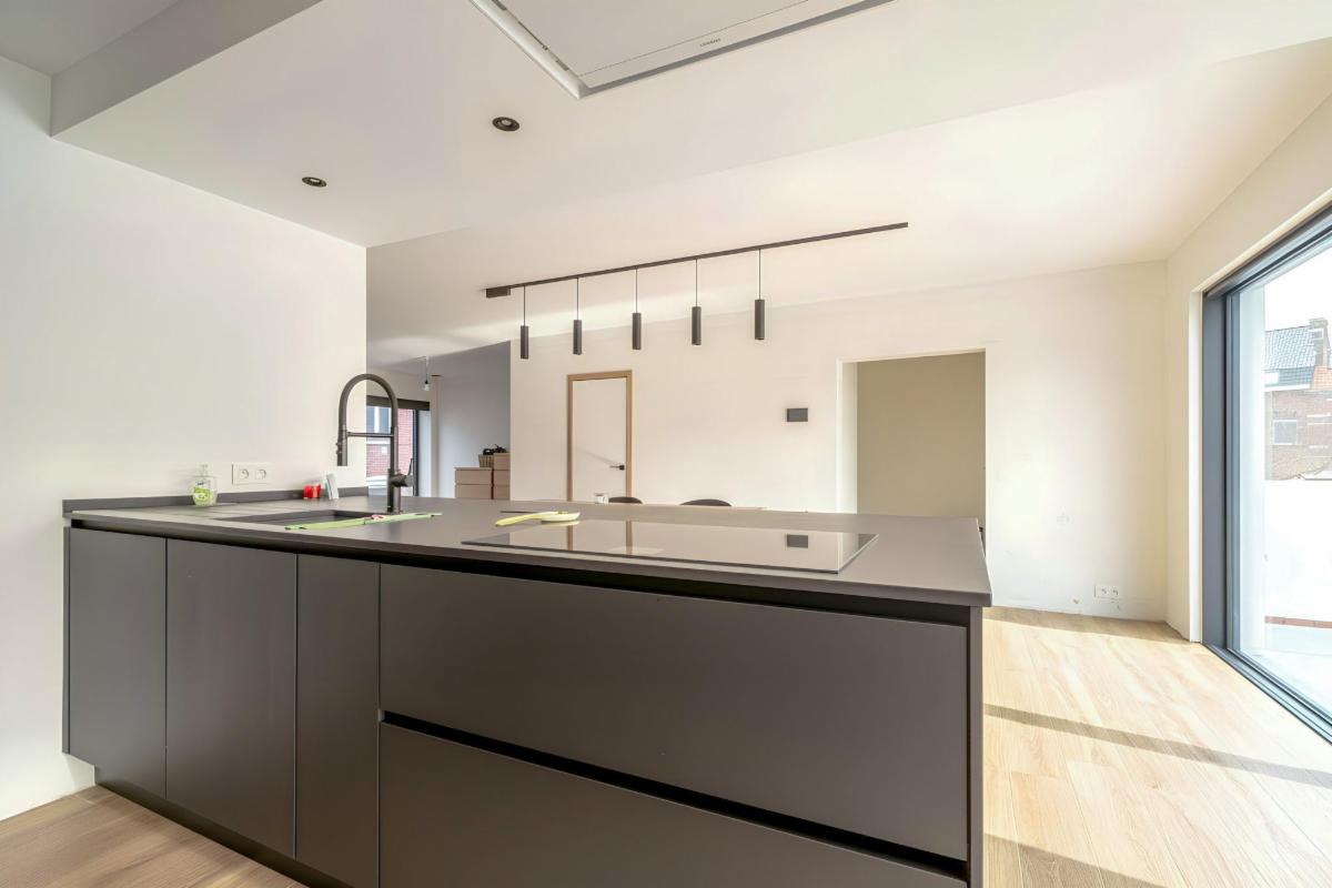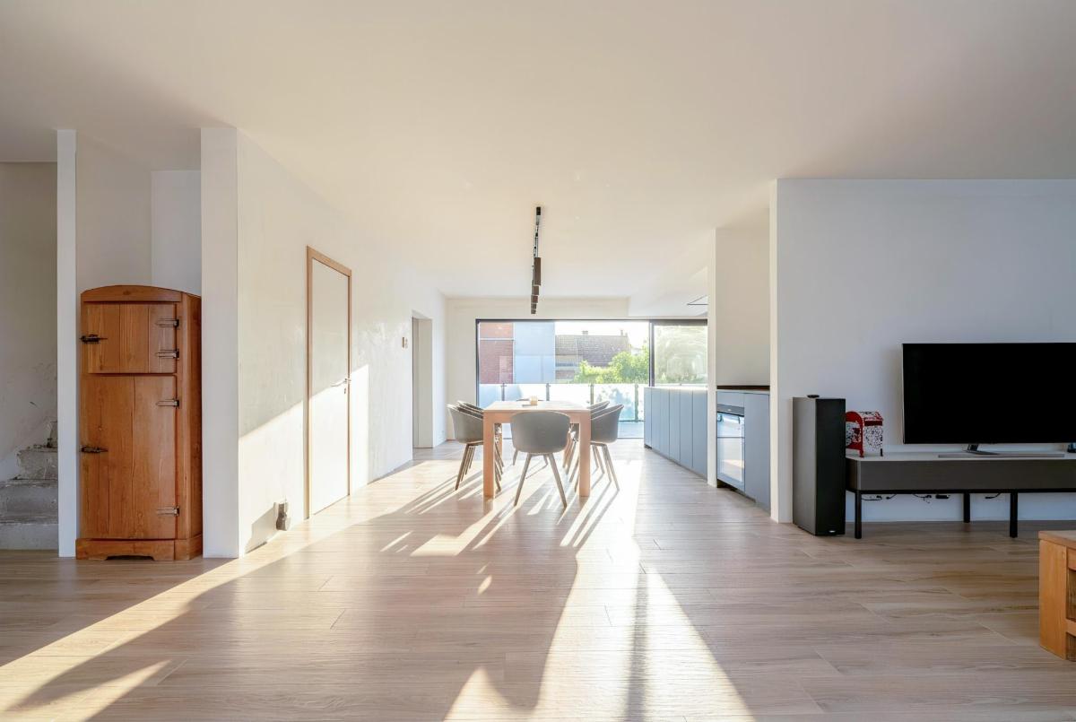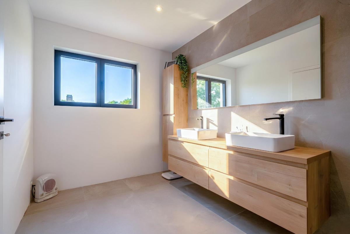 Au 1er : un WC, une vaste cuisine de qualité complètement équipée comprenant notamment un cellier électrique (wine cooler), un vaste salon-salle à manger traversant garni de grès céram, type « parquet à l'ancienne », avec accès à une terrasse équipée d’un store banne électrique par une baie vitrée, un local technique.
