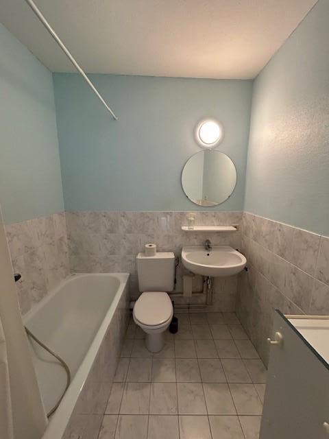 -salle de bains carrelée avec lavabo, wc et baignoire ;