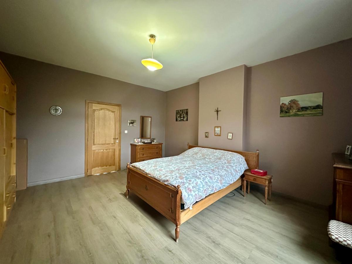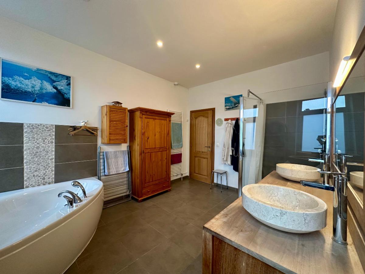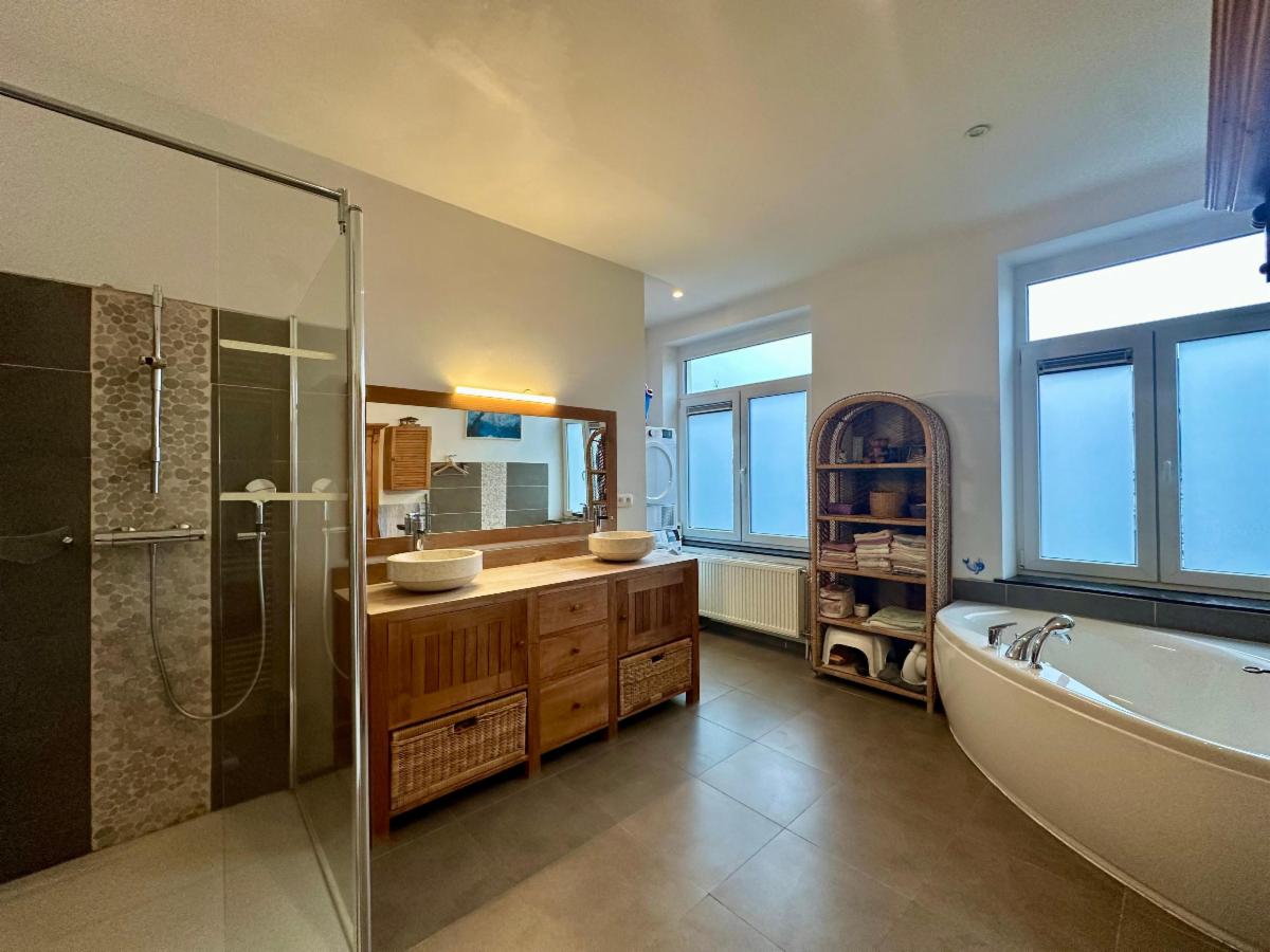 À l’étage, vous découvrirez : un hall de nuit, un WC, une grande chambre à coucher (23 m²), un coin dressing qui peut facilement être transformé en chambre supplémentaire. La salle de bains (12,8 m²) est équipée d'une baignoire d'angle, une douche, une double vasque, d'un sèche serviettes et d’un coin buanderie.