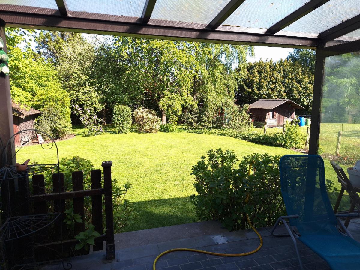 Jardin/extérieur : terrasse surélevée (à hauteur habitation), avec escalier pour accéder au jardin. L’accès à la citerne enterrée se trouve sur la terrasse, partie où il y a les escaliers ; beau et grand jardin d’agrément ; abri de jardin.