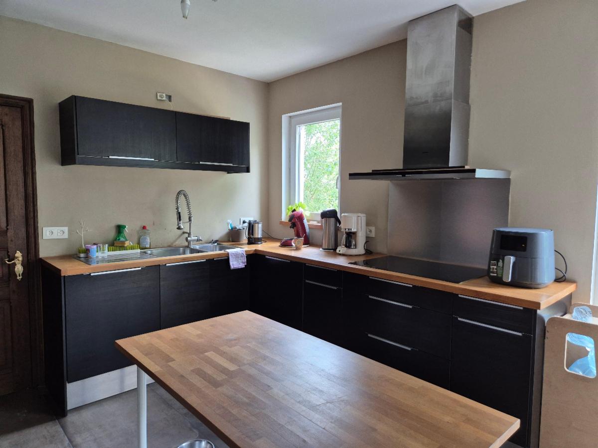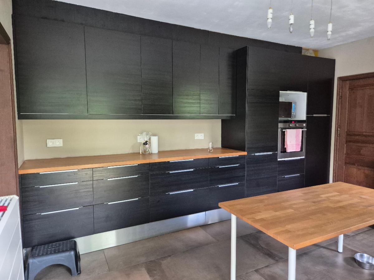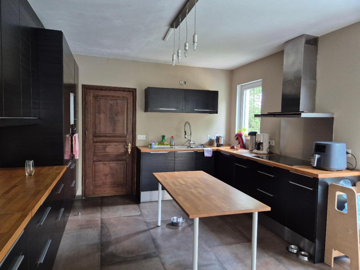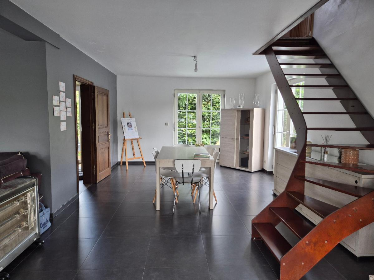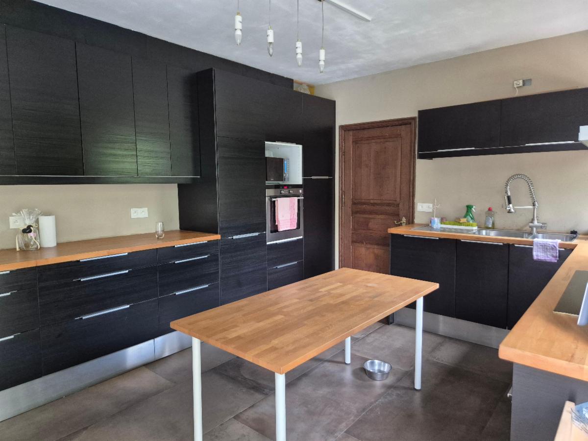 - rez : hall, salon, salle à manger, cuisine équipée (double évier, taque de cuisson, four, hotte, frigo), wc.