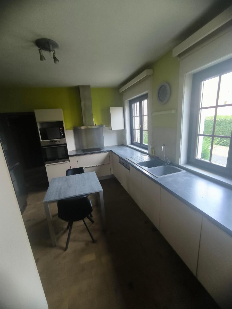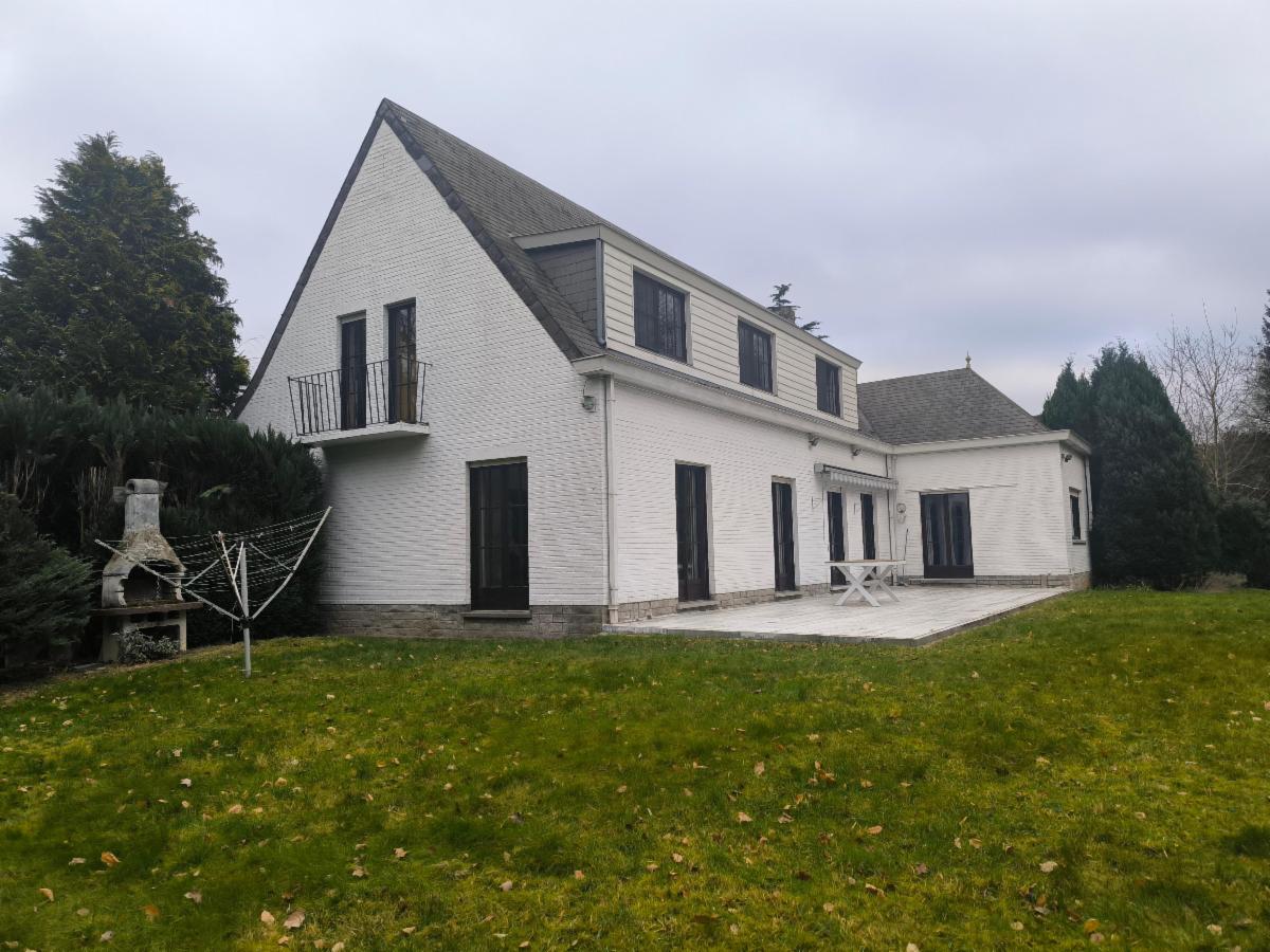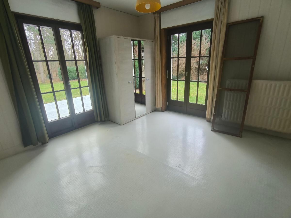 Rez-de-chaussée: grand hall d’entrée, salle à manger et grand salon avec feu ouvert, grande cuisine équipée avec frigo américain, 1 salle de bains, 1 chambre parentale, 1 bureau, 1 terrasse avec jardin et bois + passage latéral
