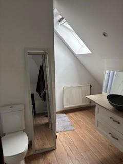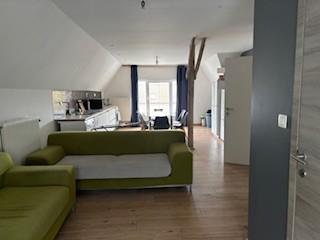 A l'étage: vaste pièce de séjour, salon, salle à manger, cuisine ouverte, 2 chambres, salle de bain, wc séparé.