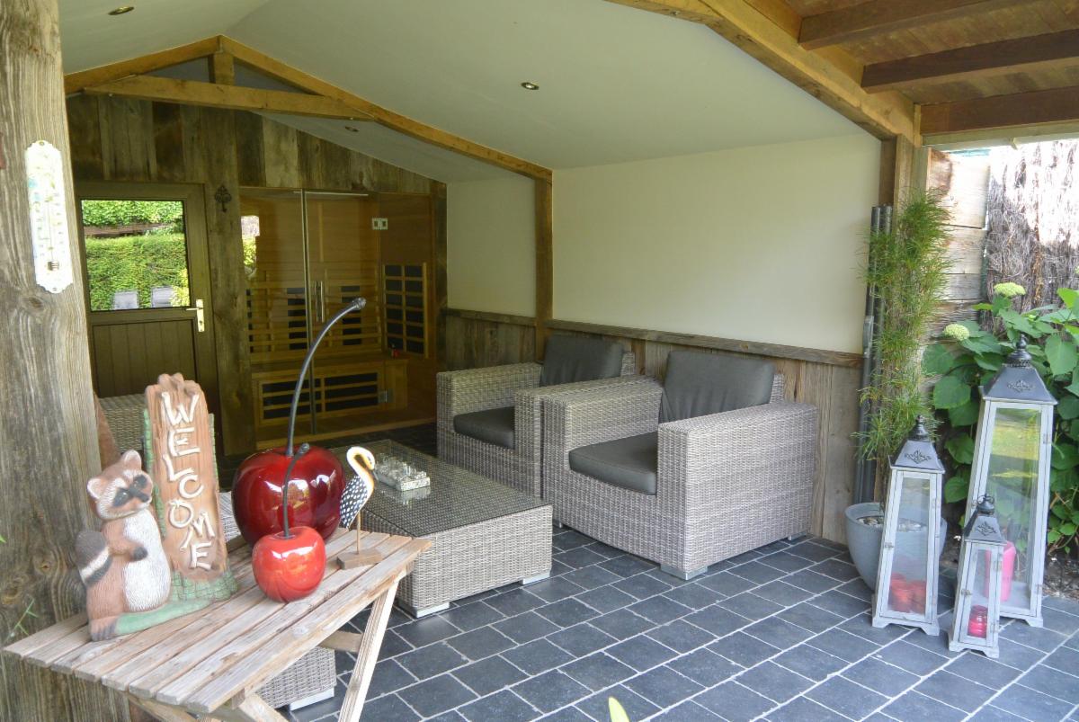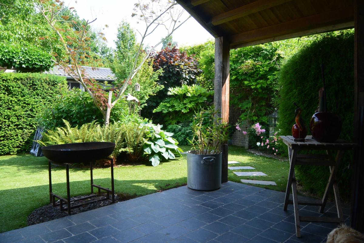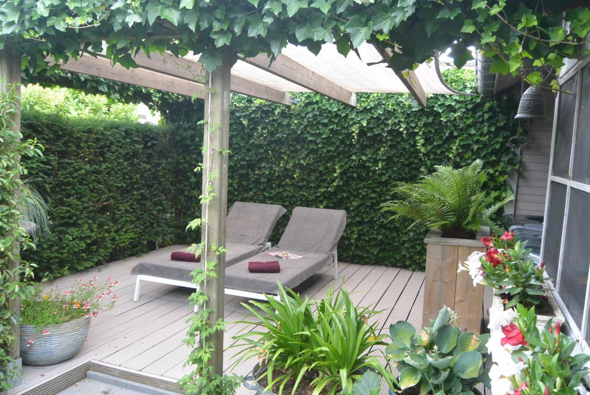 volledig aangelegde, zuidgerichte tuin met buitenkeuken en jacuzzi, apart zitgedeelte met infraroodcabine (de jacuzzi en infraroodcabine zijn ingebouwd en dus inbegrepen in de verkoop)