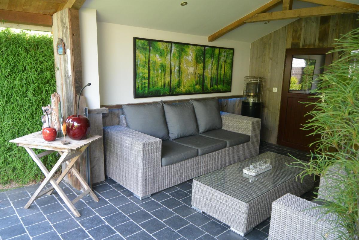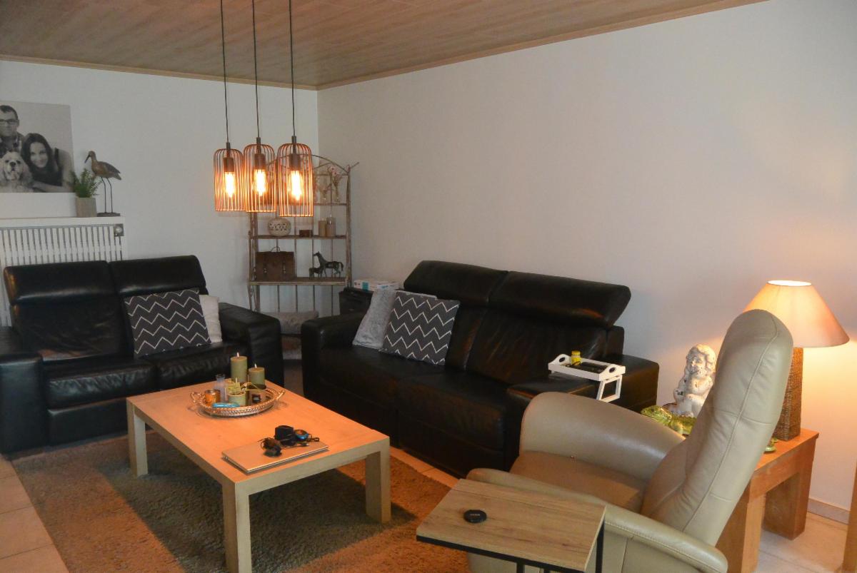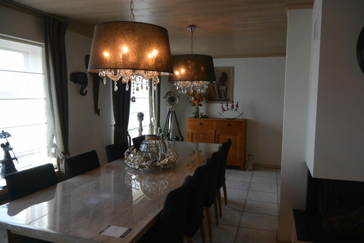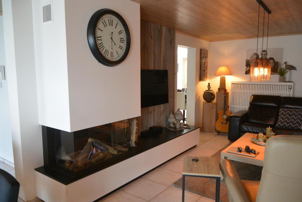 inkomhal met gastentoilet, ruime L-vormige leefruimte met open haard, uitgeruste keuken, badkamer, wasruimte, veranda met zicht op terras