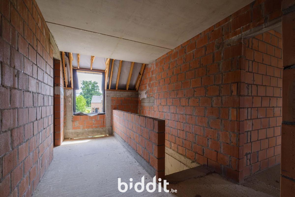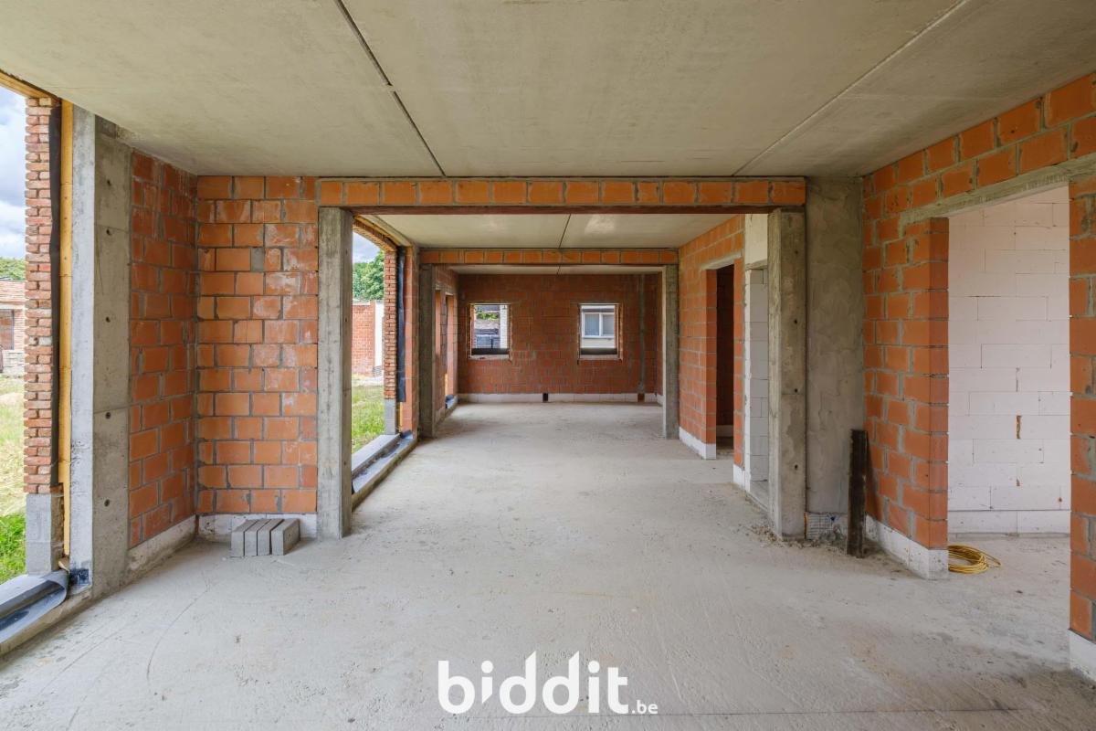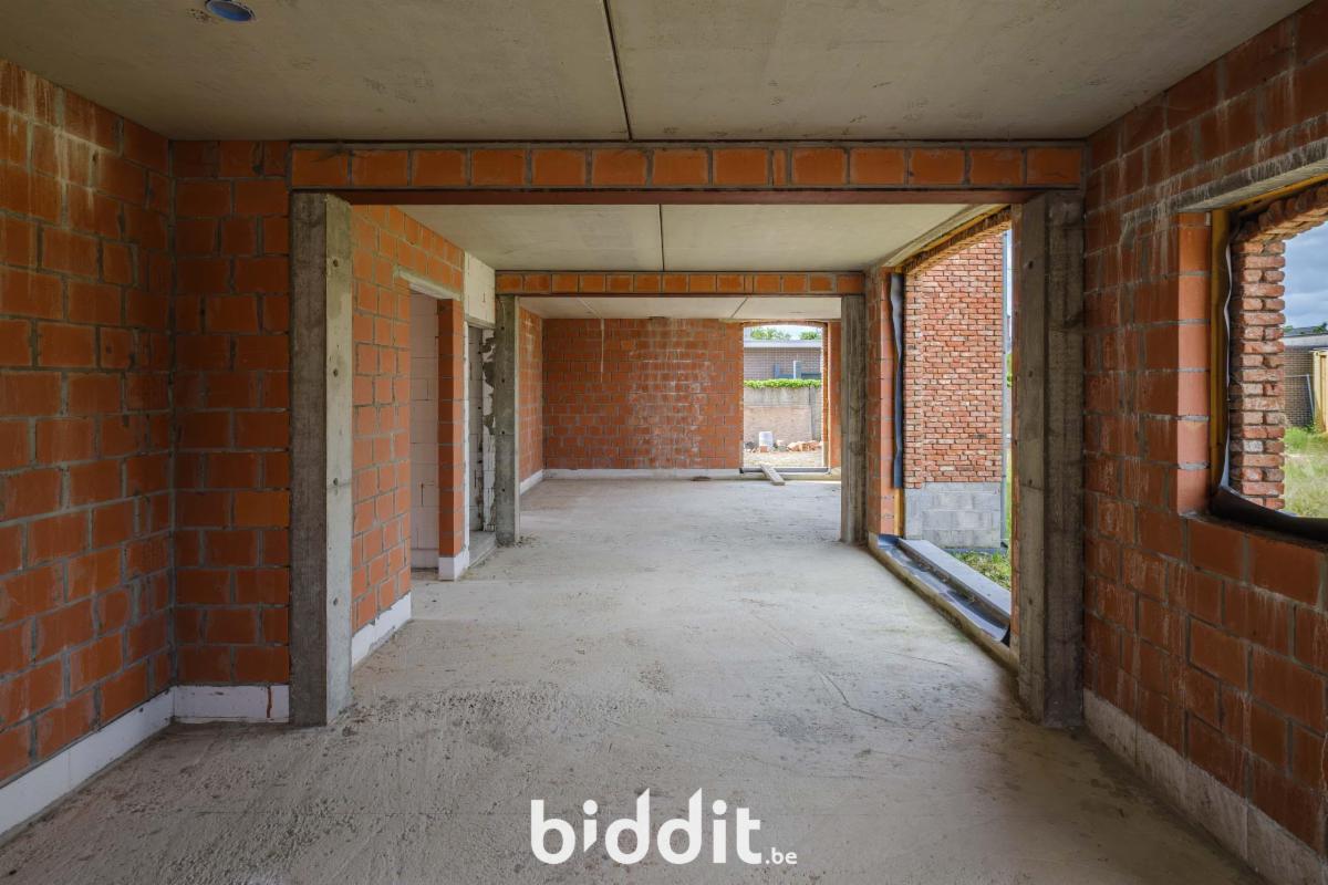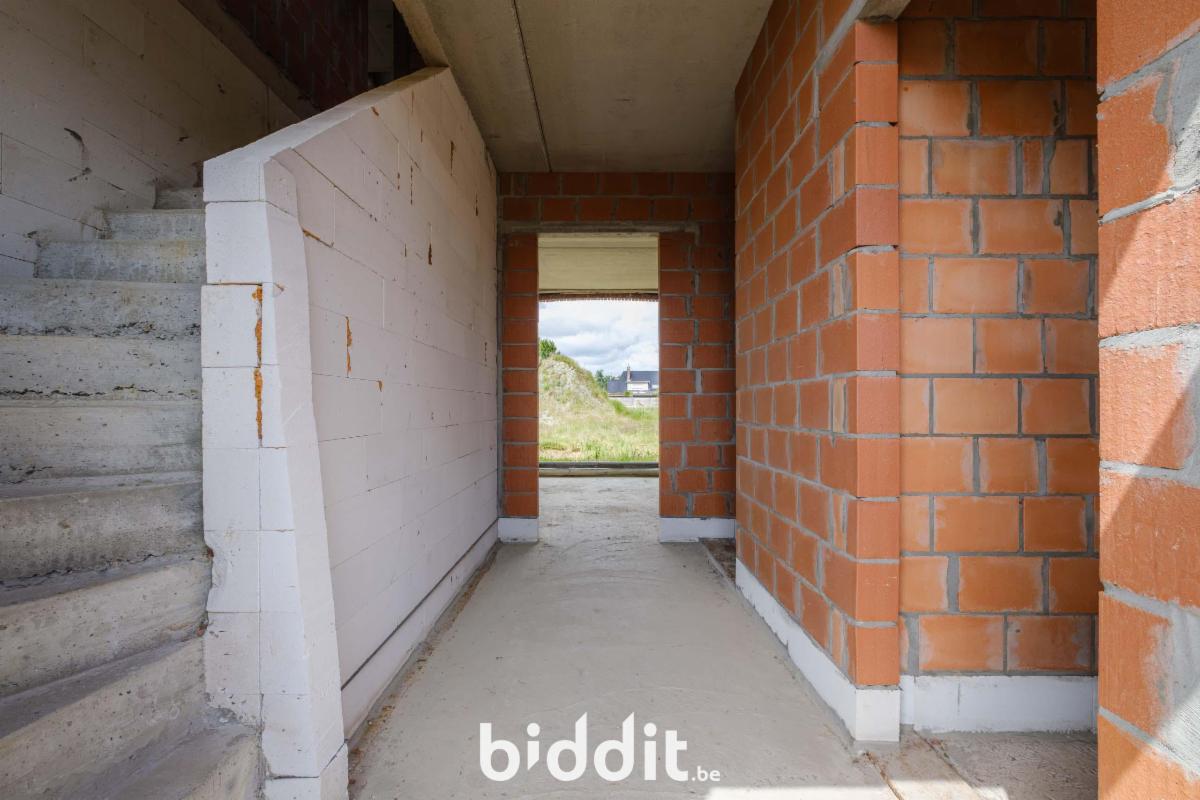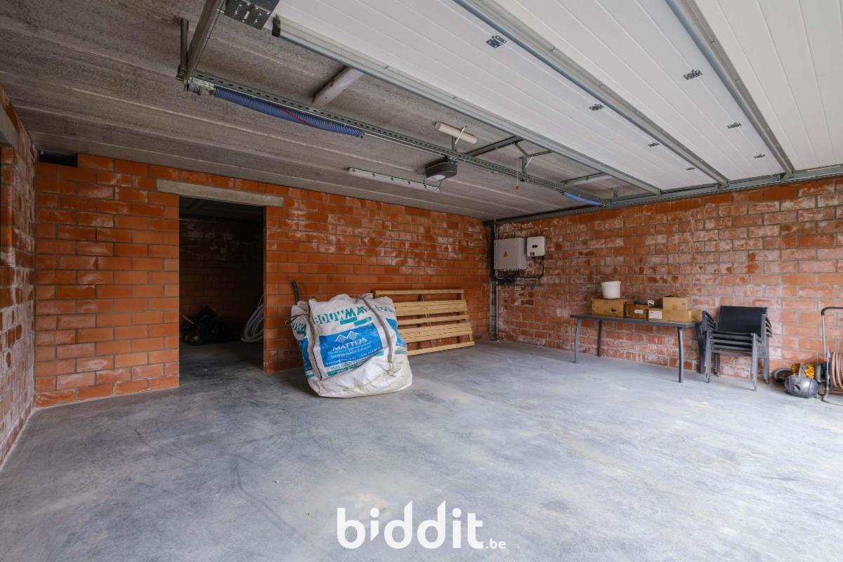 - gelijkvloers: inkom, vestiaire + trap, leefruimte, keuken en bijkeuken, bureau en overdekt terras en garage;