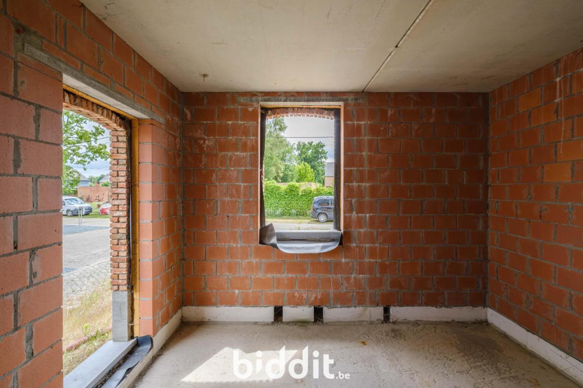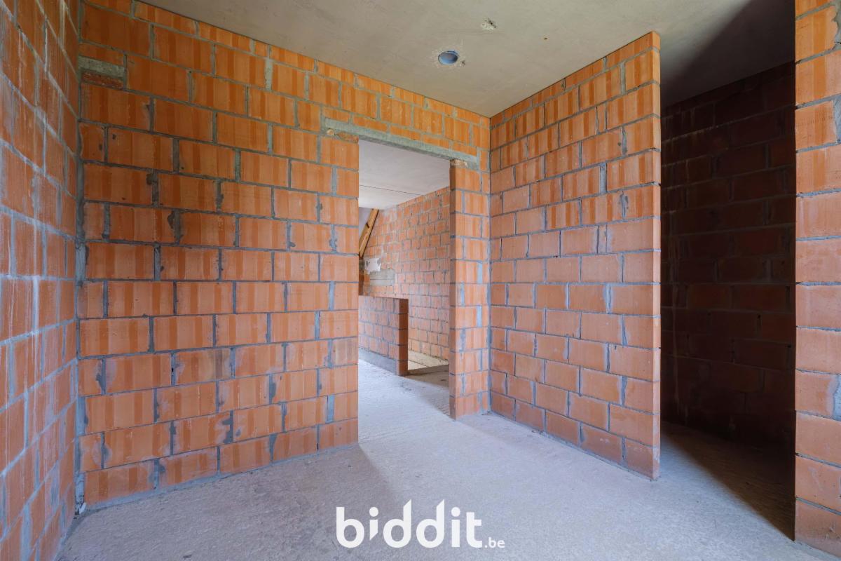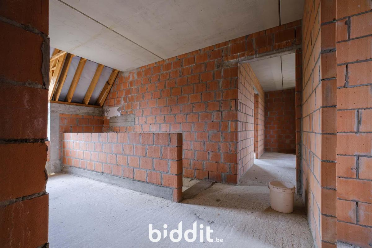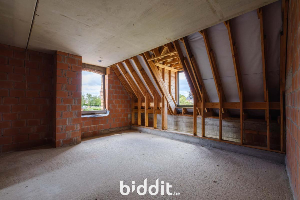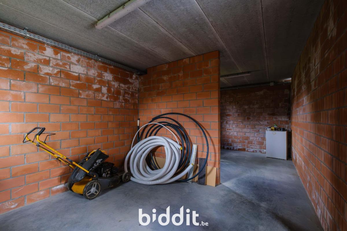 - gelijkvloers: inkom, vestiaire + trap, leefruimte, keuken en bijkeuken, bureau en overdekt terras en garage;