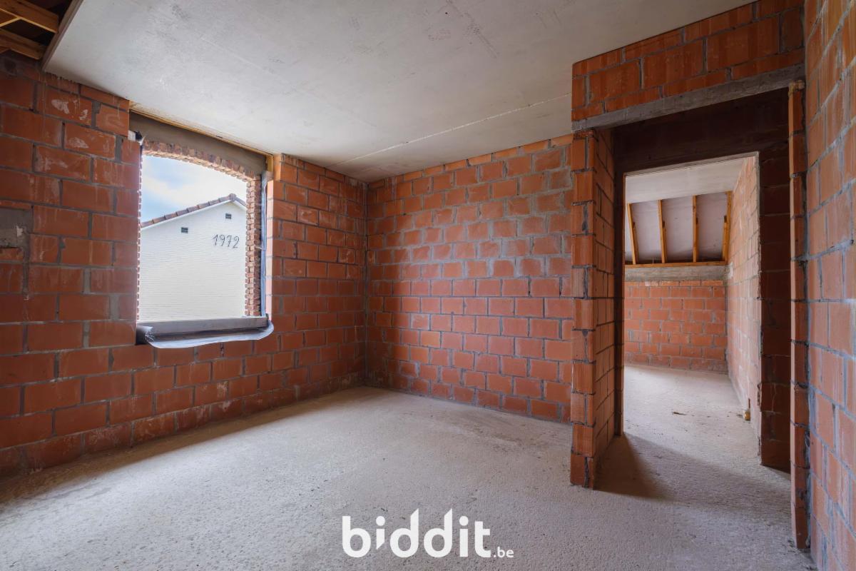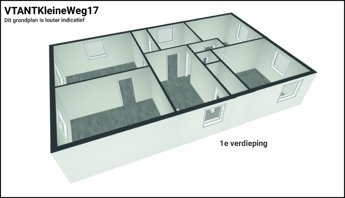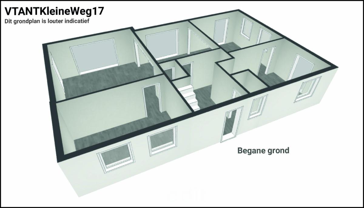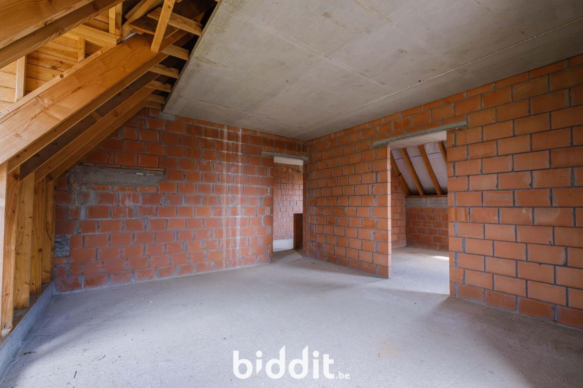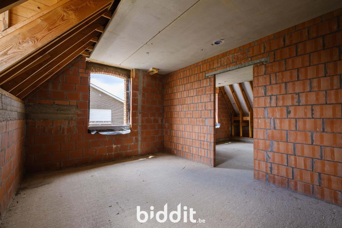 - gelijkvloers: inkom, vestiaire + trap, leefruimte, keuken en bijkeuken, bureau en overdekt terras en garage;
