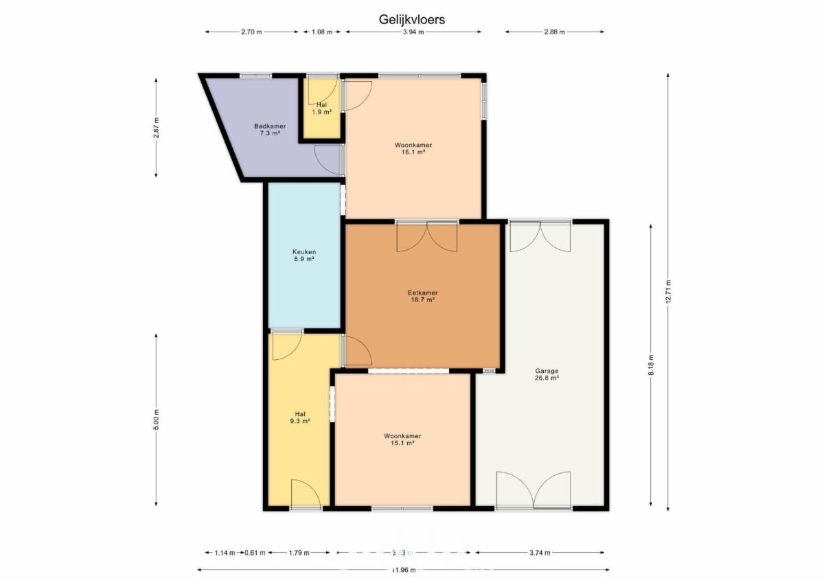 Gelijkvloers: inkom, salon-woonkamer, keuken.