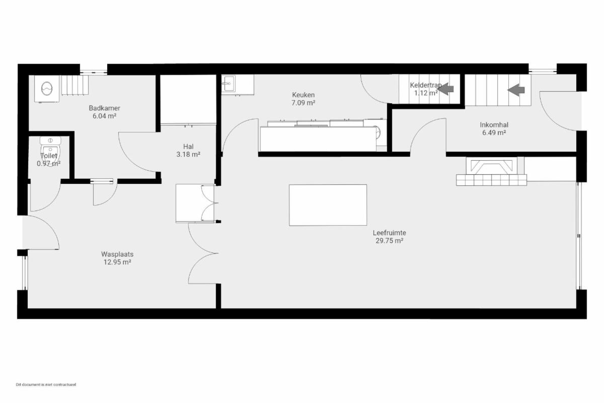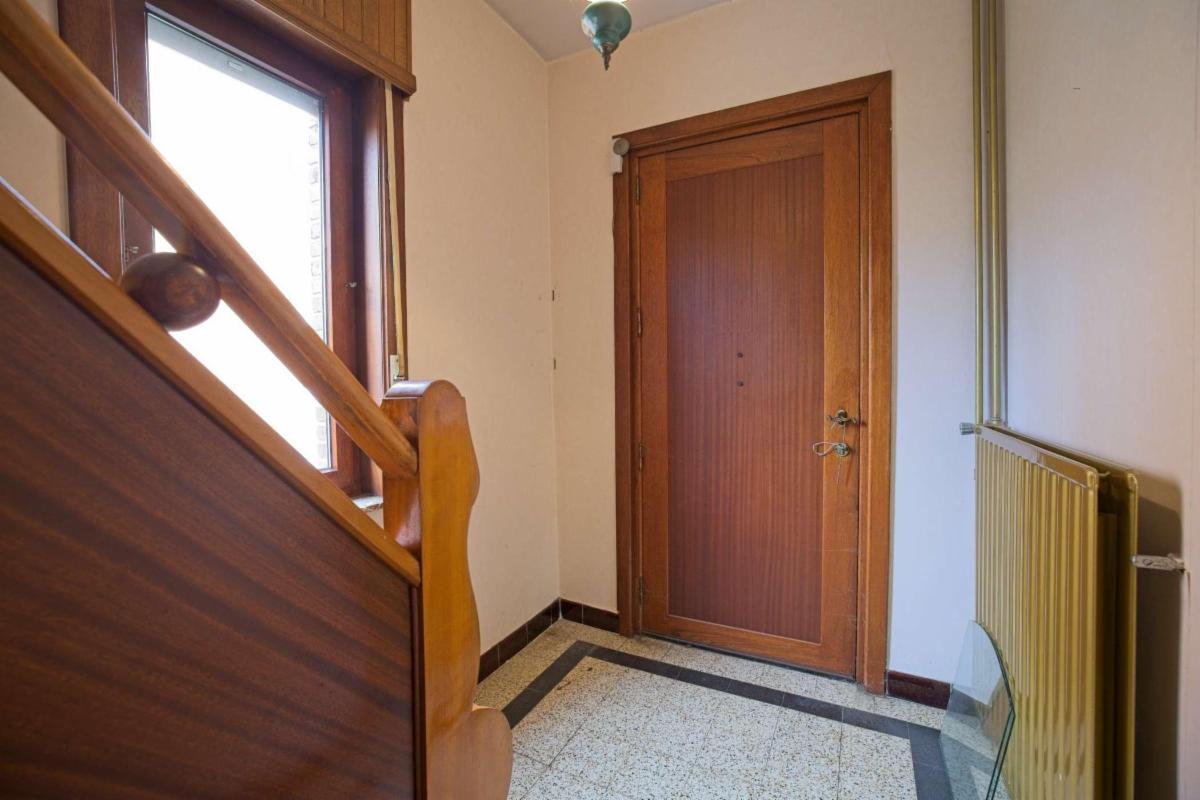 Gelijkvloers (69 m²): inkomhal met trap, leefruimte, keuken, veranda, badkamer, wc, tuin met berging (46 m²) en garage (17 m²).