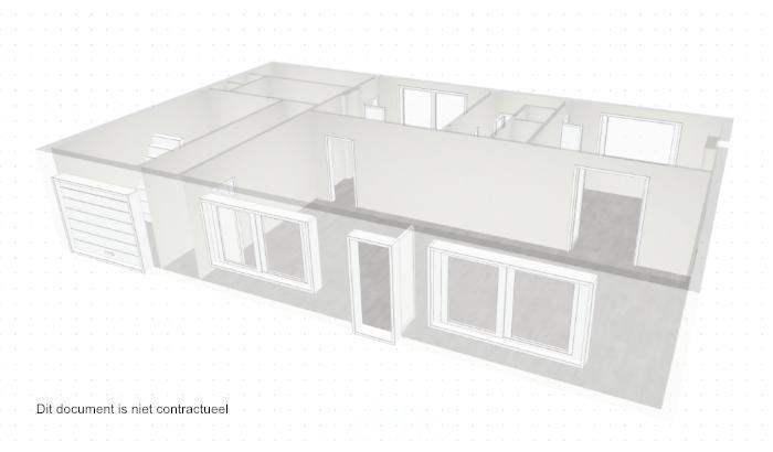 - gelijkvloers: woonkamer, badkamer (toilettafel, douche, toilet), keuken, grote berging, stookruimte, garage voor 1 auto en tuin;